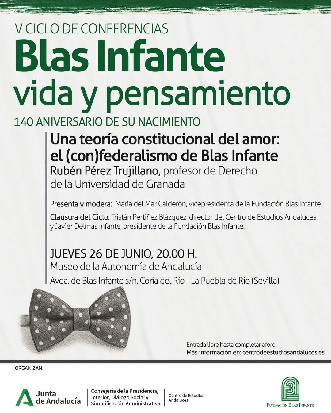"Una teoría constitucional del amor: el (con)federalismo de Blas Infante", a cargo de Rubén Pérez Trujillano, profesor de Derecho de la Universidad de Granada, presentado por María del Mar Calderón, vicepresidenta de la Fundación Blas Infante.