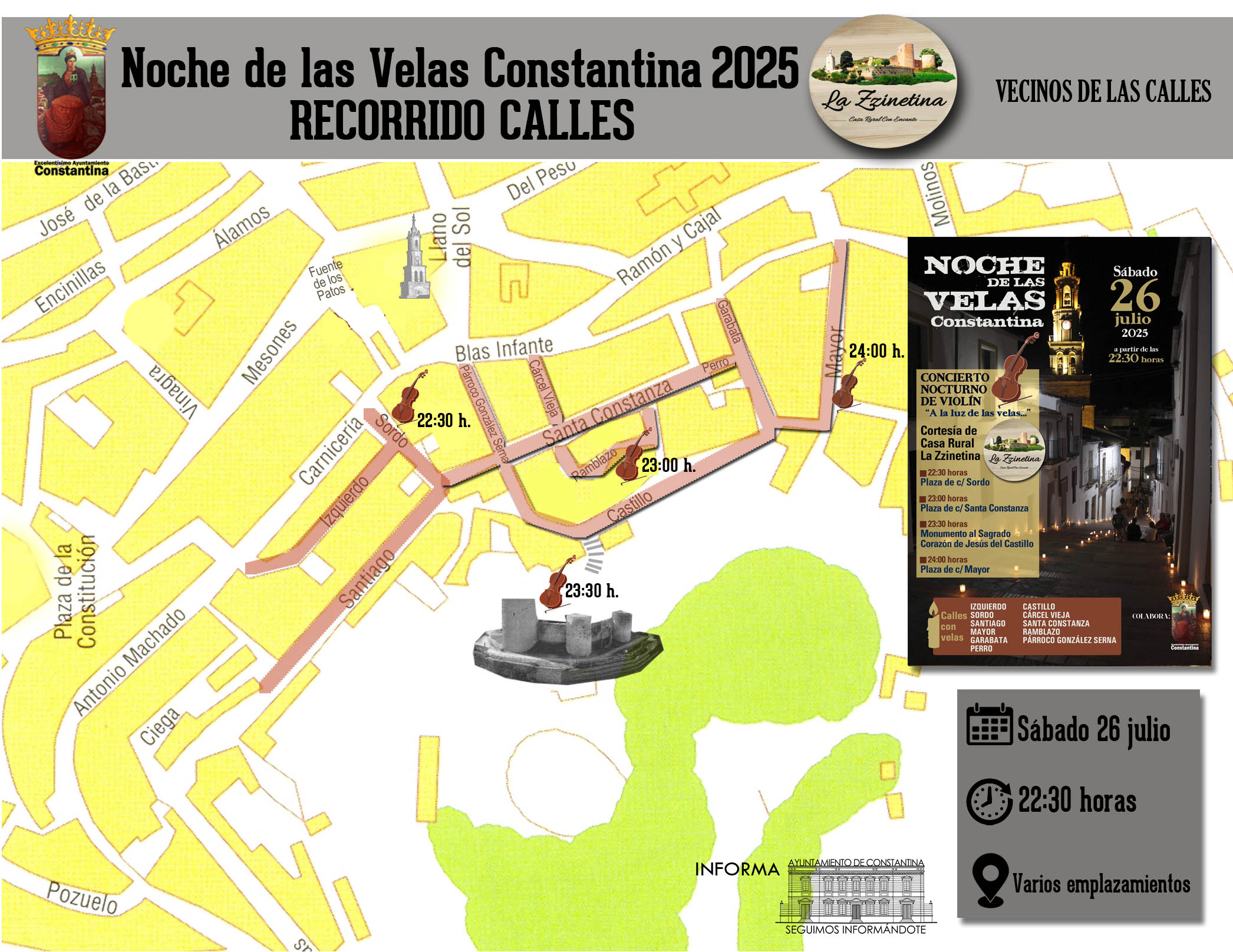 Las velas adornarán y embellecerán las siguientes callejuelas y rincones del casco histórico de Constantina, convirtiendo en un maravilloso escenario y una cita ineludible, el recorrido por sus calles: