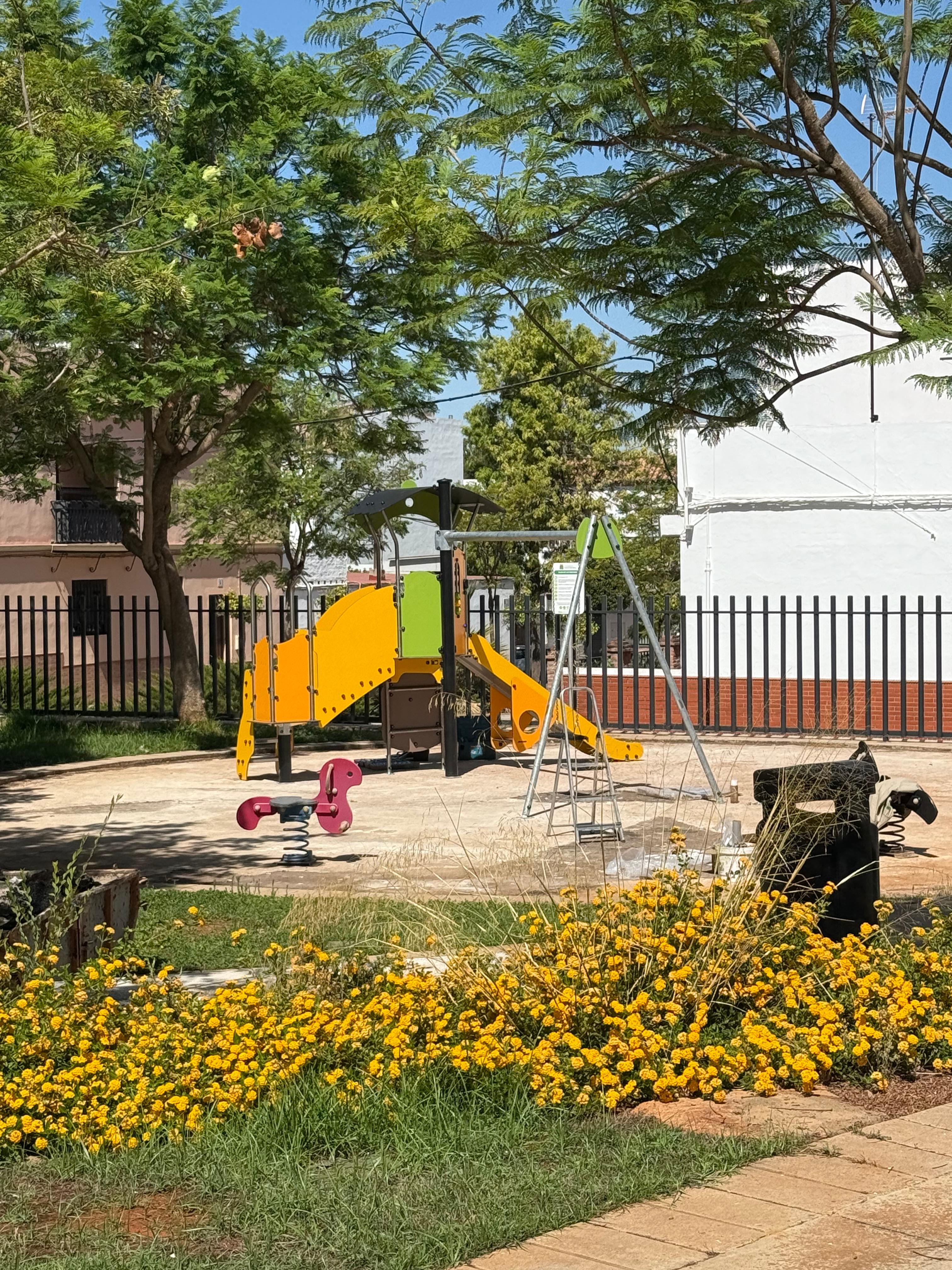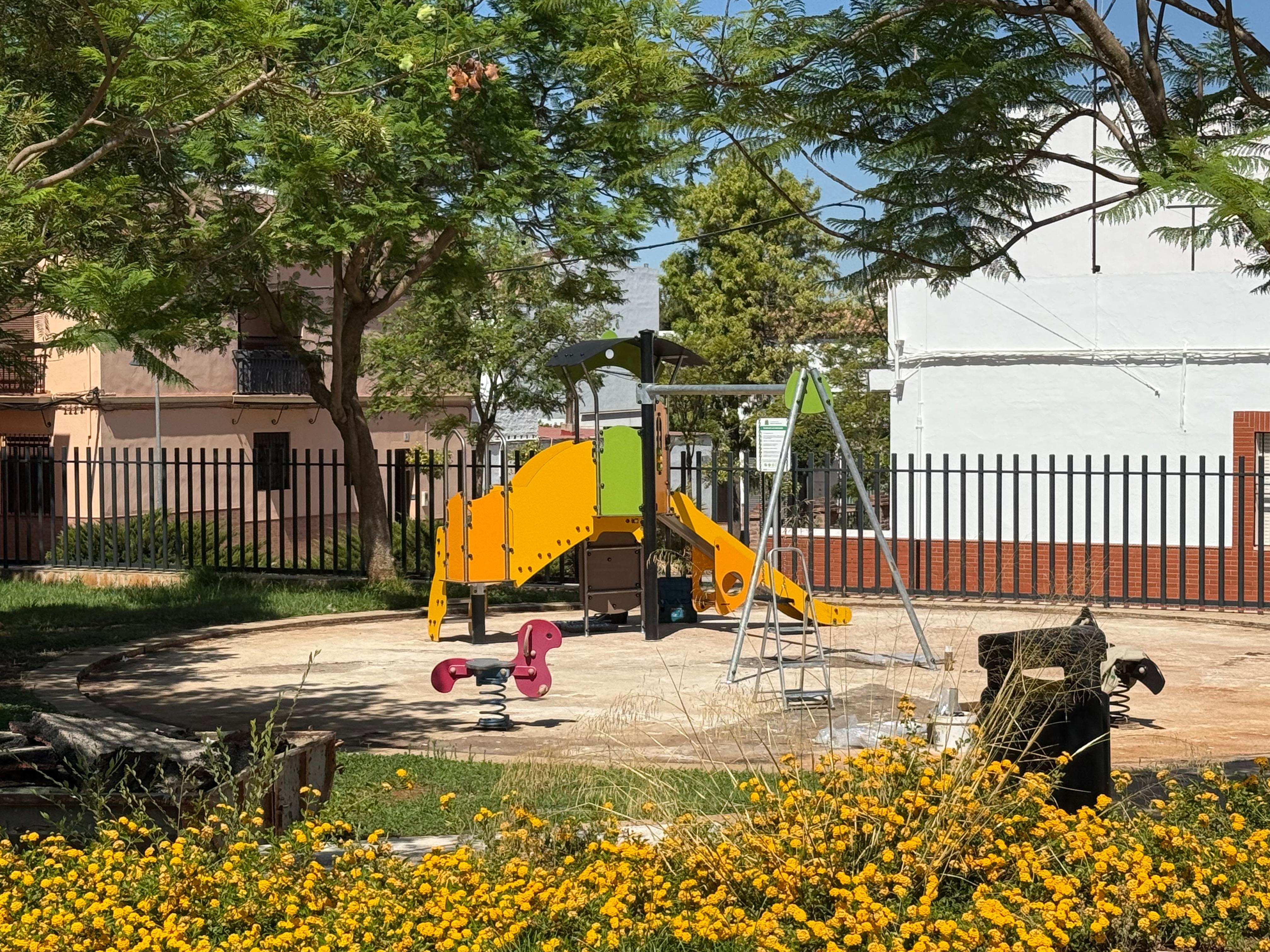 El área de juegos infantiles del parque situado en la Plaza de los Pintores, entre las calles Pablo Picasso y Vázquez Díaz en Las Palmeritas, se está renovando en estos días para garantizar un entorno seguro y accesible.