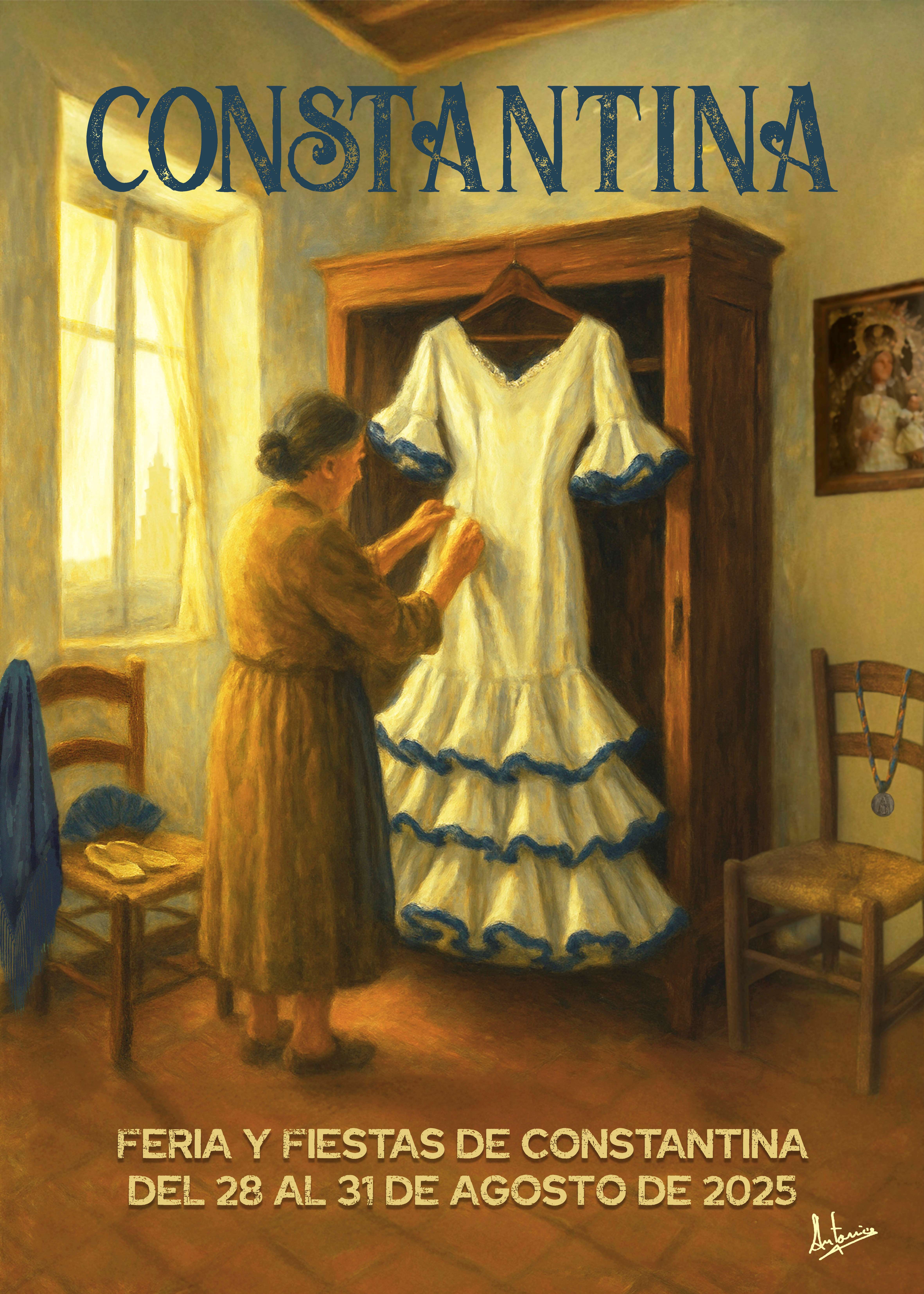 La obra digital de nuestro paisano Antonio Navarro Lara "Luz de agosto" se proclamó vencedora con un total de 15 puntos. Original obra de arte que recoge una entrañable escena, esencia de nuestras fiestas y costumbres. Lleno de referencias a ellas, obliga a contemplar el cartel con detenimiento para ir saboreando cada uno de los detalles que en él se encuentran. Una señora mayor mima los últimos preparativos de un traje de flamenca que cuelga en un armario y espera a ser vestido. La luz protagonista del cuadro entra a través de una ventana con visillos tras la cual se adivina la silueta de nuestra Torre. A ambos lados de ese ropero, dos sillas de enea con objetos de nuestras tradiciones y un cuadro de la Virgen del Robledo en la pared.