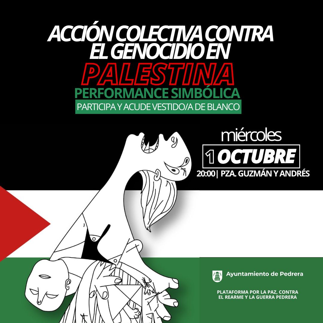 La Plataforma por la Paz, contra el rearme y la guerra de Pedrera,y el Ayuntamiento, convocan a la ciudadanía a participar en una "Acción colectiva contra el genocidio en Palestina" que se celebrará el próximo miércoles, 1 de octubre, a las 20:00 horas en la plaza Guzmán y Andrés.
