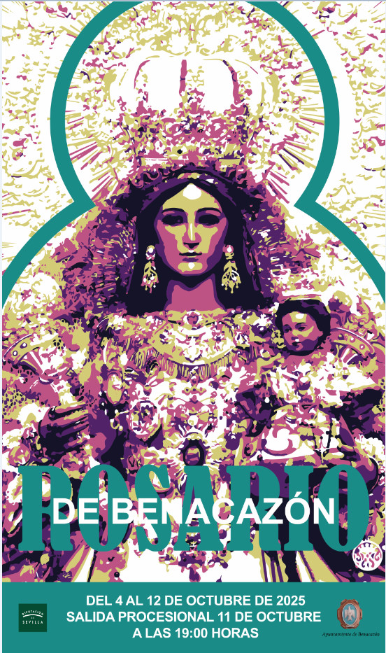 Compartimos el díptico de Solemnes Cultos -impreso por la Diputación de Sevilla a través del Ayuntamiento de Benacazón-, dando comienzo hoy a las 21:00 h. SOLEMNE TRIDUO (7, 8 y 9 de octubre) en honor a la Santísima Virgen del Rosario, en la Iglesia Parroquial de Santa María de las Nieves. - 10 de octubre: Santo Rosario de Gala a las 21:00 h. por las calles de Benacazón, acompañado por un quinteto musical. - 11 de octubre: Solemne Función Principal de Instituto a las 11:00 h. en la Iglesia Parroquial de Santa María de las Nieves, con pública Protestación de Fe y predicada por el Excelentísimo y Reverendísimo Señor D. Ramón Darío Valdivia Giménez, Obispo Auxiliar de Sevilla. Acompañará musicalmente el Grupo de Cámara Santa Cecilia, de Sevilla. Tras la Función Principal, Ofrenda Floral a nuestra titular por parte del Excelentísimo Ayuntamiento de Benacazón, Hermandades, autoridades y devotos que lo deseen. A las 19:00 h., Solemne Procesión Triunfal de Gloria de Nuestra Gran Madre y Señora, Reina del Santo Rosario, por las calles de Benacazón, acompañada musicalmente por la Banda de Música Nuestra Señora de las Nieves, de Olivares.