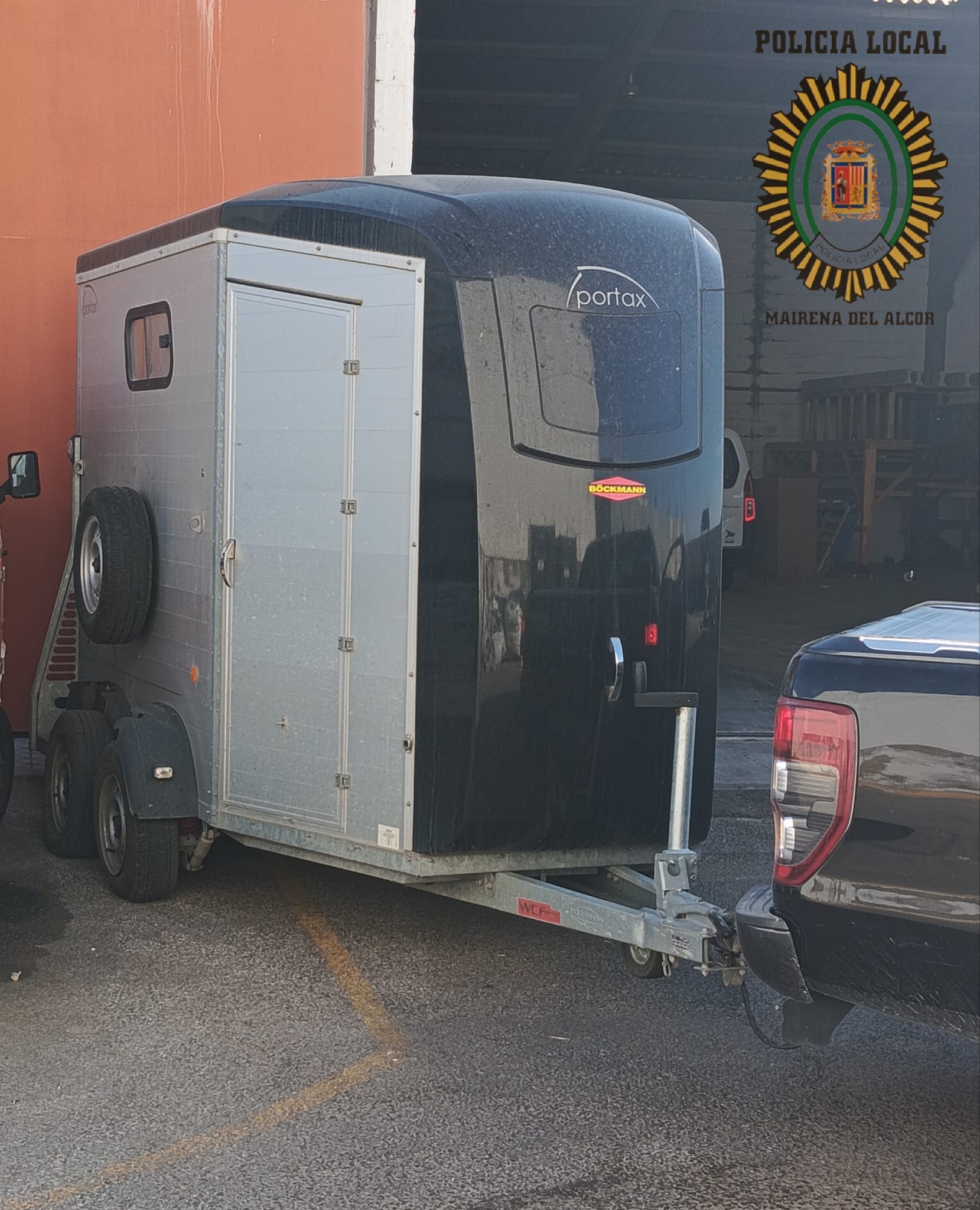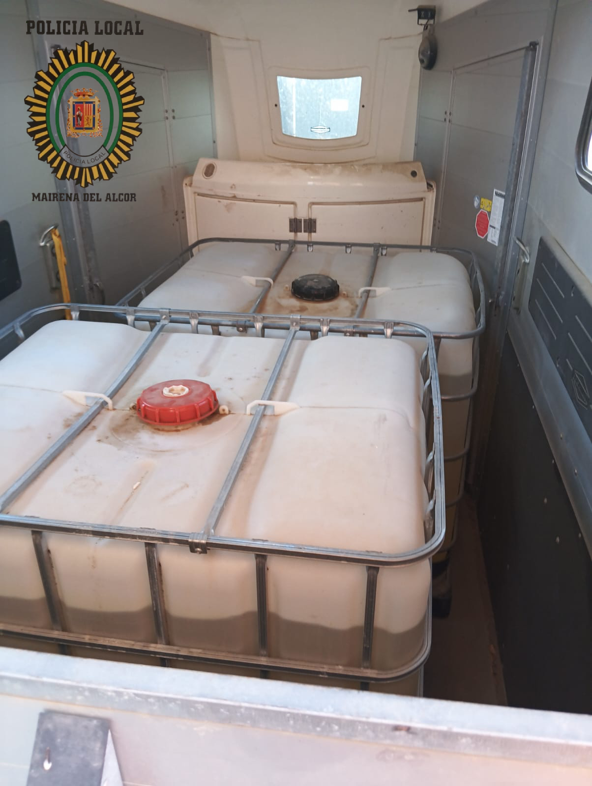La Policía Local de Mairena del Alcor ha intervenido un remolque Van, destinado al transporte de caballos, que cargaba en su interior 2.000 litros de gasolina depositada en el interior de dos grandes recipientes de plástico de 1.000 litros cada uno.