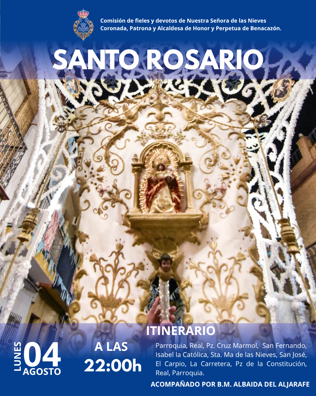 Seguidamente, SANTO ROSARIO DE VÍSPERAS a las 22:00 h. por las calles del pueblo, acompañado por la Banda Municipal de Albaida del Aljarafe, con el siguiente ITINERARIO: Parroquia, Real, Plaza Cruz Mármol, San Fernando, Isabel la Católica, Santa María de las Nieves, San José, El Carpio, La Carretera, Plaza de la Constitución, Real y Parroquia.