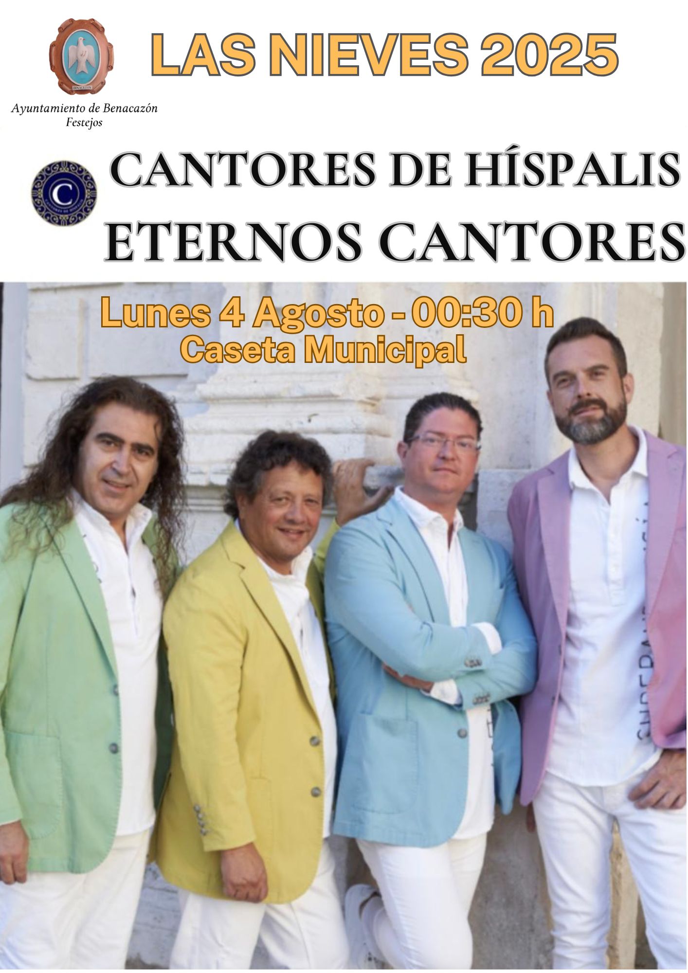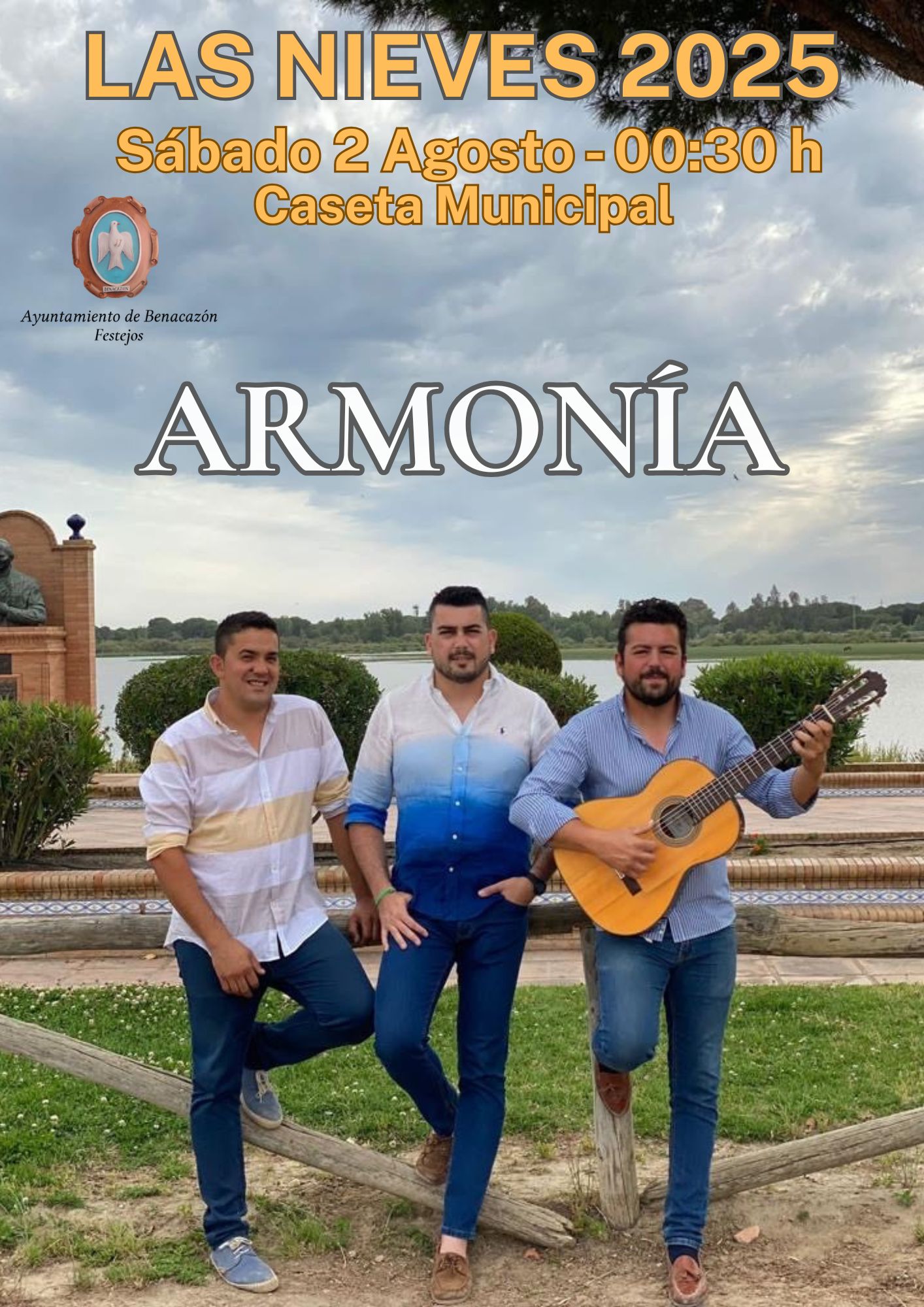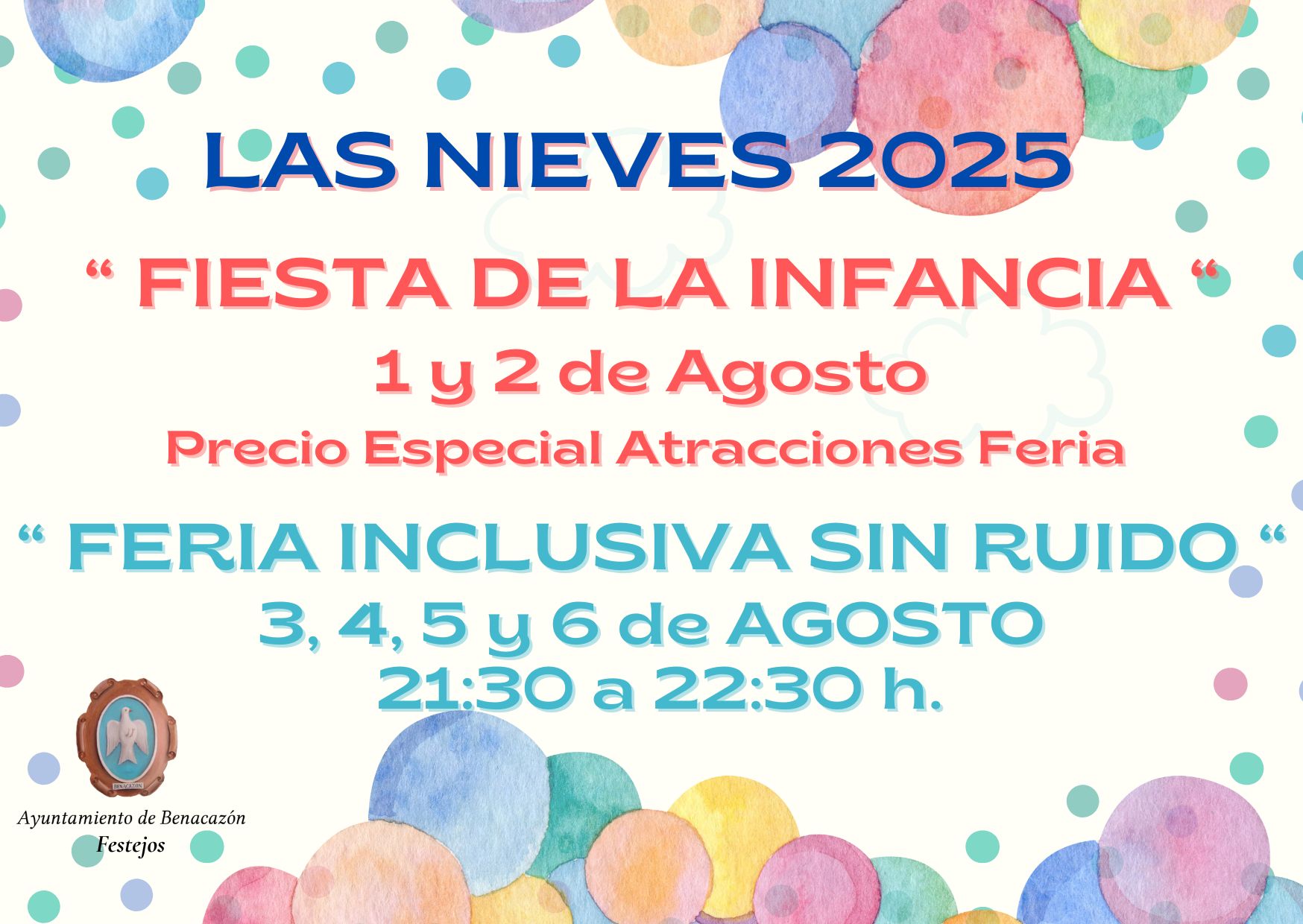El Ayuntamiento de Benacazón informa de la Programación organizada por la Concejalía de Festejos para las Fiestas Patronales de Las Nieves 2025, que se celebran del 2 al 6 de Agosto. Bandas de Música que amenizarán nuestras Fiestas además de Conciertos, los tradicionales Toros de Fuegos durante todas las fiestas, Fuegos Artificiales, Fiesta de la Infancia y feria Inclusiva, entre otras actividades.