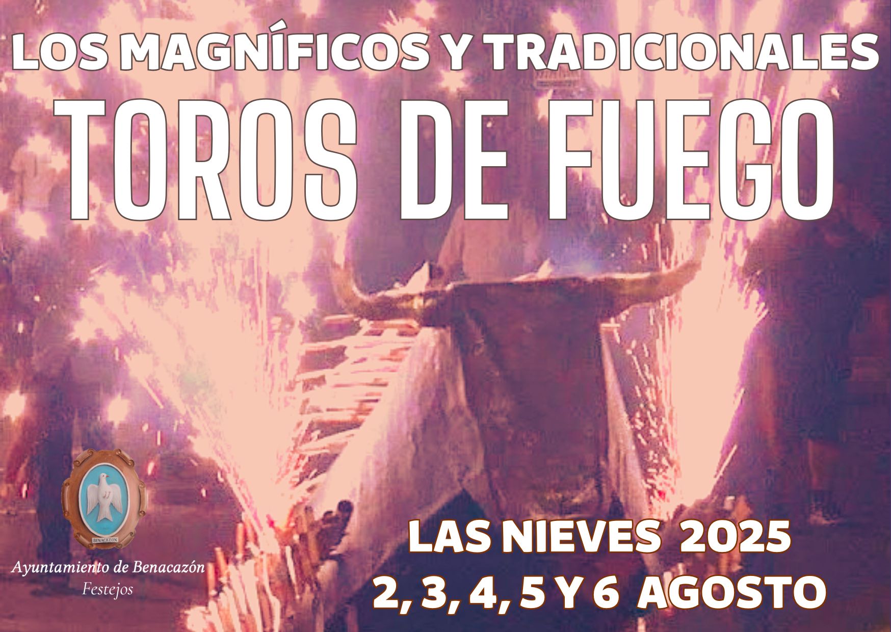 No podían faltar en Benacazón los tradicionales Toros de Fuegos que se quemarán por el recorrido habitual del 2 al 6 de agosto. Y, como cierre de nuestras Fiestas Patronales, el día 6 podremos disfrutar de Fuegos Artificiales al pasar la Virgen por el Monumento del Colegio "Ntra. Sra. de las NIEVES".