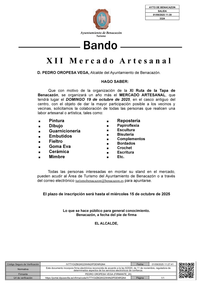 El Ayuntamiento de Benacazón informa que, con motivo de la organización de la XI edición de la Ruta de la Tapa de Benacazón, la Delegación de Turismo organizará un año más el MERCADO ARTESANAL, que tendrá lugar el domingo 19 de Octubre en el casco antiguo de Benacazón.