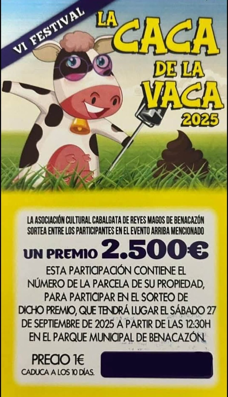 El Ayuntamiento de Benacazón informa sobre la celebración del Festival "LA CACA DE LA VACA 2025", que tendrá lugar el sábado 27 de Septiembre a partir de las 12:30 del mediodía en el Parque Municipal de Benacazón, organizado por la Asociación de la Cabalgata de Reyes Magos con la colaboración de la Concejalía de Festejos. Los beneficios, tanto de la venta de papeletas como del ambigú, se destinarán a la Cabalgata 2026.