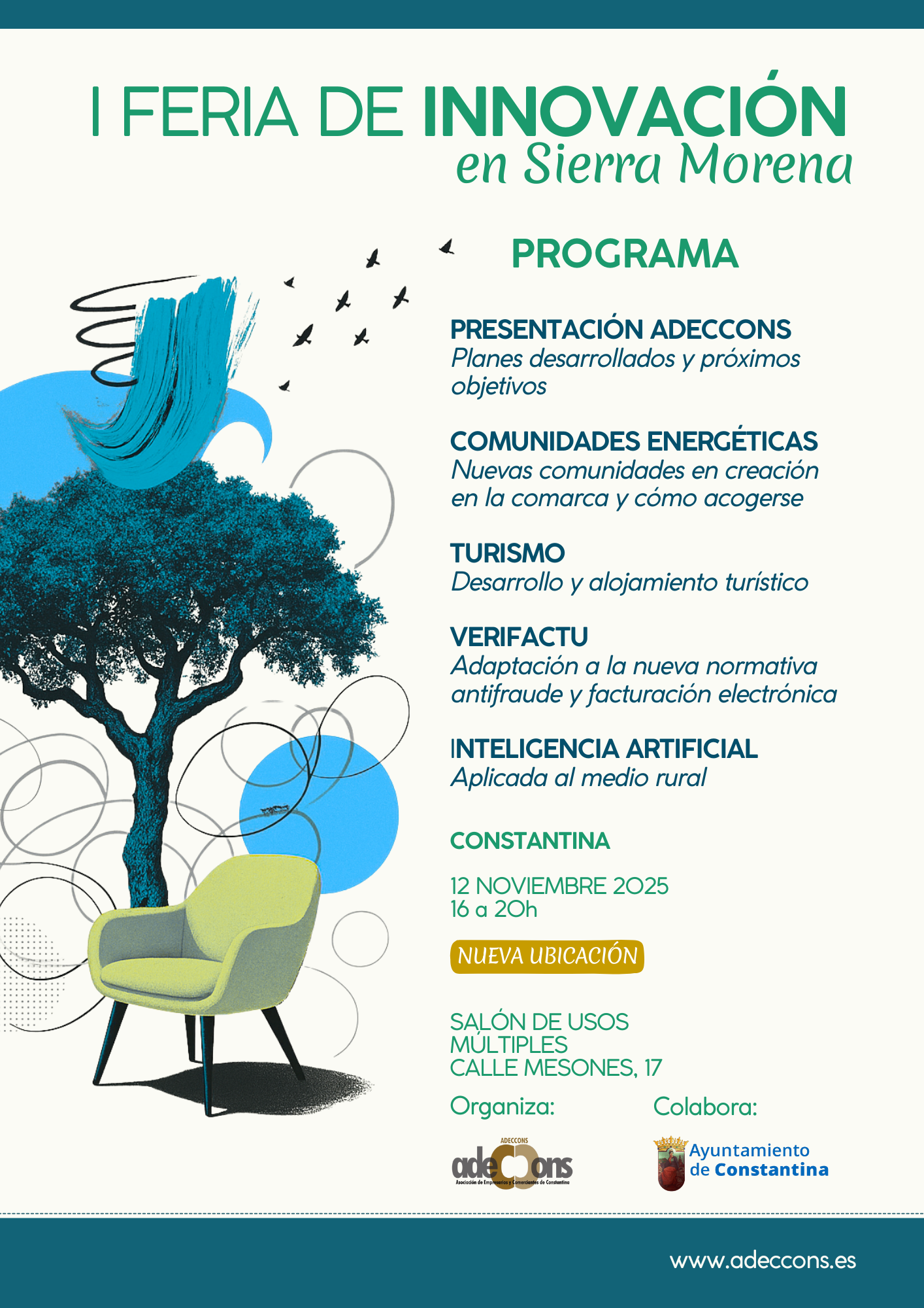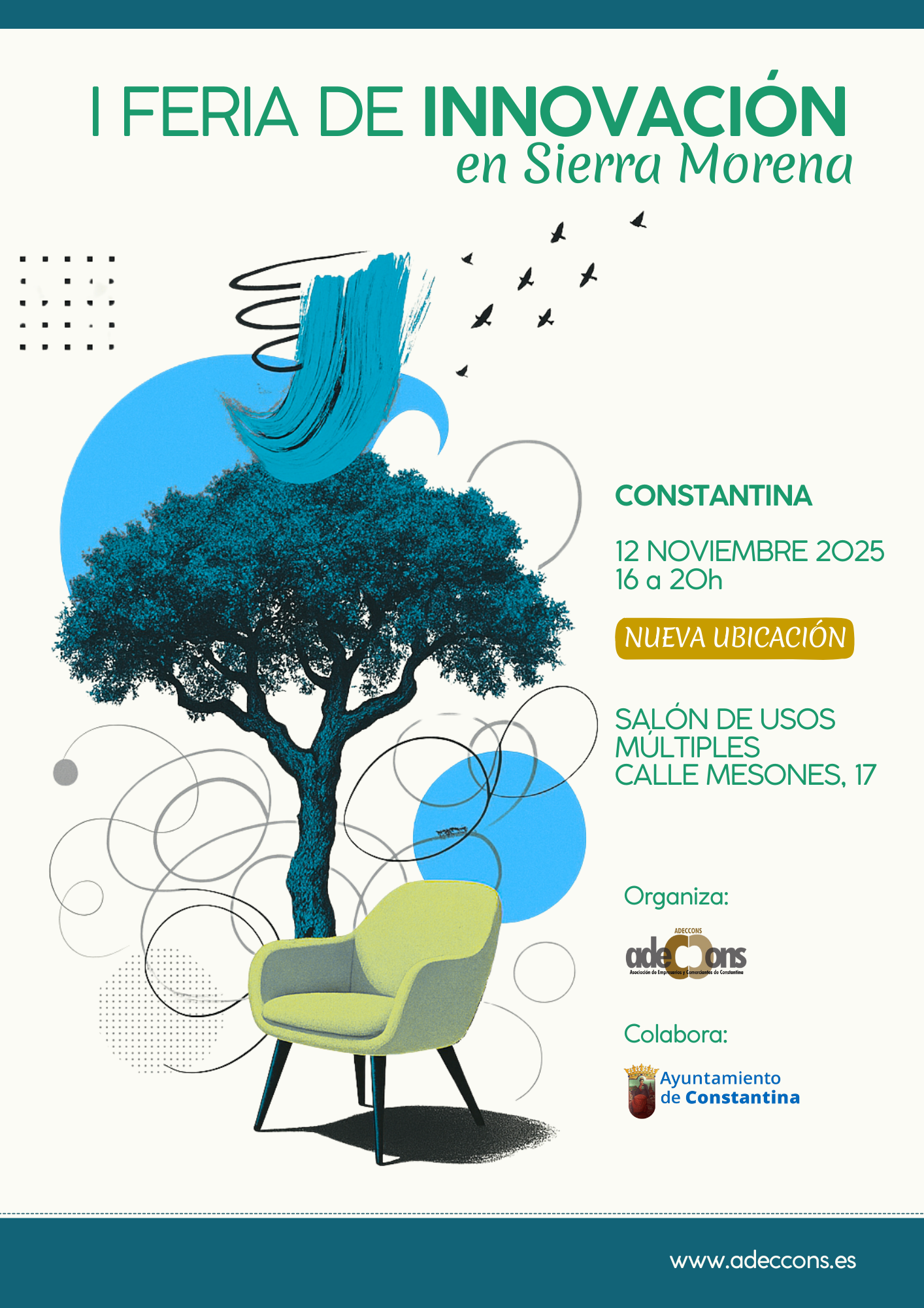 La Asociación de Empresarios y Comerciantes de Constantina Adeccons, en colaboración con el Ayuntamiento de Constantina organiza el próximo miércoles 12 de noviembre, de 16:00 a 20:00 horas, en el Salón de Usos Múltiples de calle Mesones, la I FERIA DE LA INNOVACIÓN EN SIERRA MORENA, un encuentro al que están convocados empresarios, agentes locales, profesionales y personas en búsqueda activa de empleo de la comarca y que girará en torno a la transformación económica y digital.