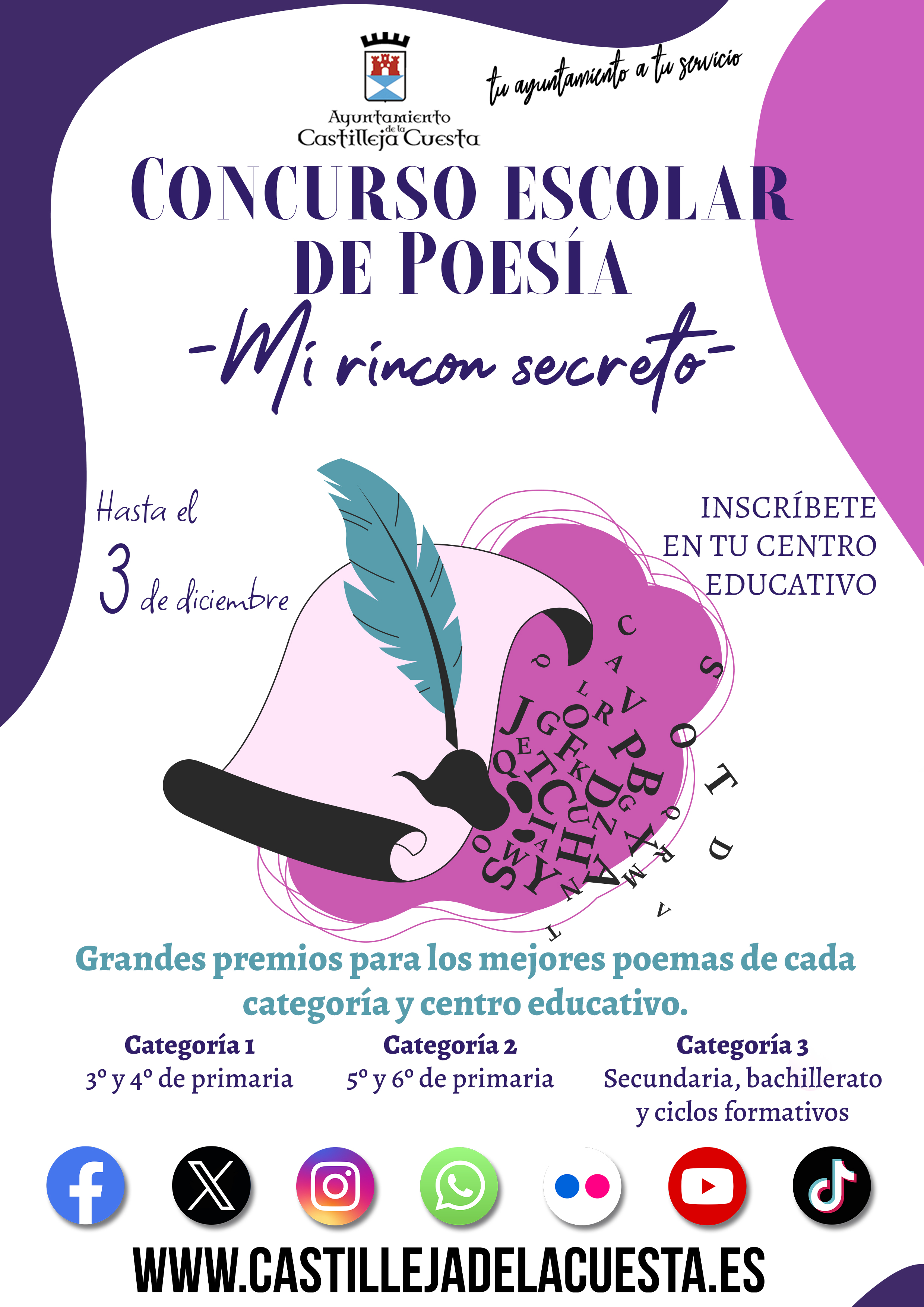 Fecha inicio Jue, 06/11/2025 - 11:18 Fecha fin Mié, 03/12/2025 - 11:18 Imágenes Ubicación Categoría evento Ciudadanía Mostrar en el carrusel de la sección No Más información http://www.castillejadelacuesta.es/es/actualidad/eventos/Concurso-Escolar-de-Po…