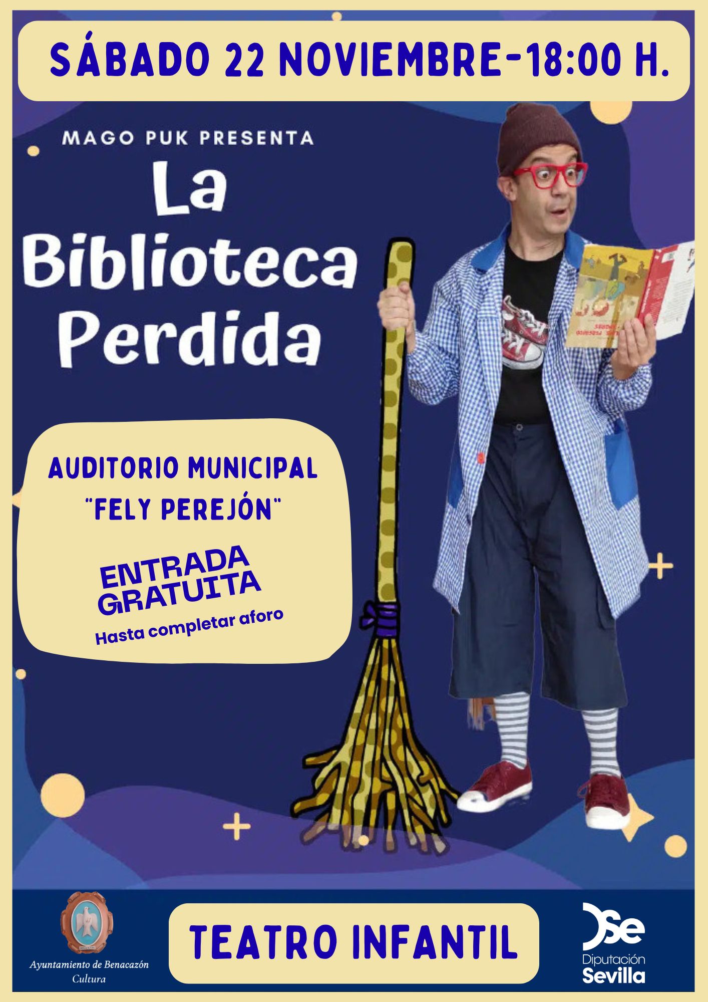 El Ayuntamiento de Benacazón informa de la próxima actividad cultural, el Teatro Infantil "LA BIBLIOTECA PERDIDA" de Mago Puk, que tendrá lugar el Sábado 22 de noviembre a las 17:00 h. en Plaza Blas Infante, organizada por la Concejalía de Cultura, a través del Programa 107 de la Diputación de Sevilla. La Delegada del área, María Rosario Fernández Santos, os invita a asistir en familia a esta obra infantil, y seguir la Programación Cultural en Benacazón a través de nuestros medios: web municipal, Facebook "Ayuntamiento de Benacazón", Instagram @ayuntamiento.benacazon, X @benacazon y WhatsApp del Ayto. de Benacazón -solo uso informativo, no admite respuesta- (añade a contactos el 673 369 649 y envía ALTA Nombre y Apellidos).