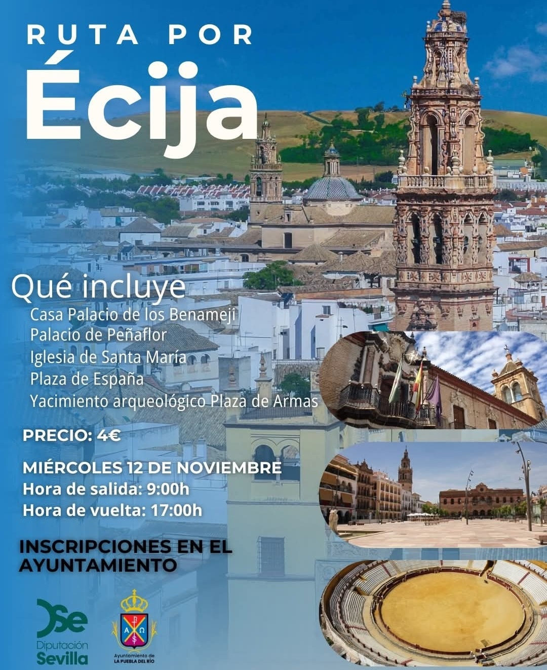 Fecha inicio Mié, 12/11/2025 - 09:00 Fecha fin Mié, 12/11/2025 - 17:00 Imágenes Ubicación Categoría evento Cultura Mostrar en el carrusel de la sección No Más información http://www.lapuebladelrio.es/es/actualidad/eventos/Ruta-por-Ecija/