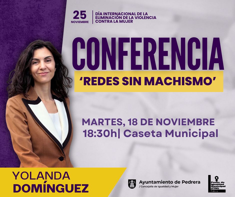 El próximo martes 18 de noviembre, a las 18:30 horas, la Caseta Municipal de Pedrera acogerá la conferencia "Redes sin machismo", a cargo de Yolanda Domínguez, reconocida experta en comunicación igualitaria y activista feminista.