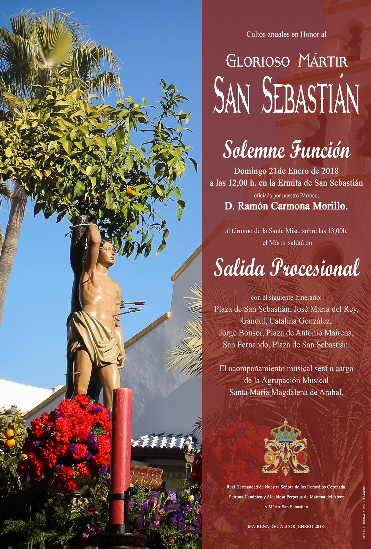 A las 13 horas, el mártir saldrá en procesión por las calles José María del Rey, José Sarmiento Aguilar, Gandul, Catalina González, Jorge Bonsor, plaza Antonio Mairena, San Fernando y plaza San Sebastián.
