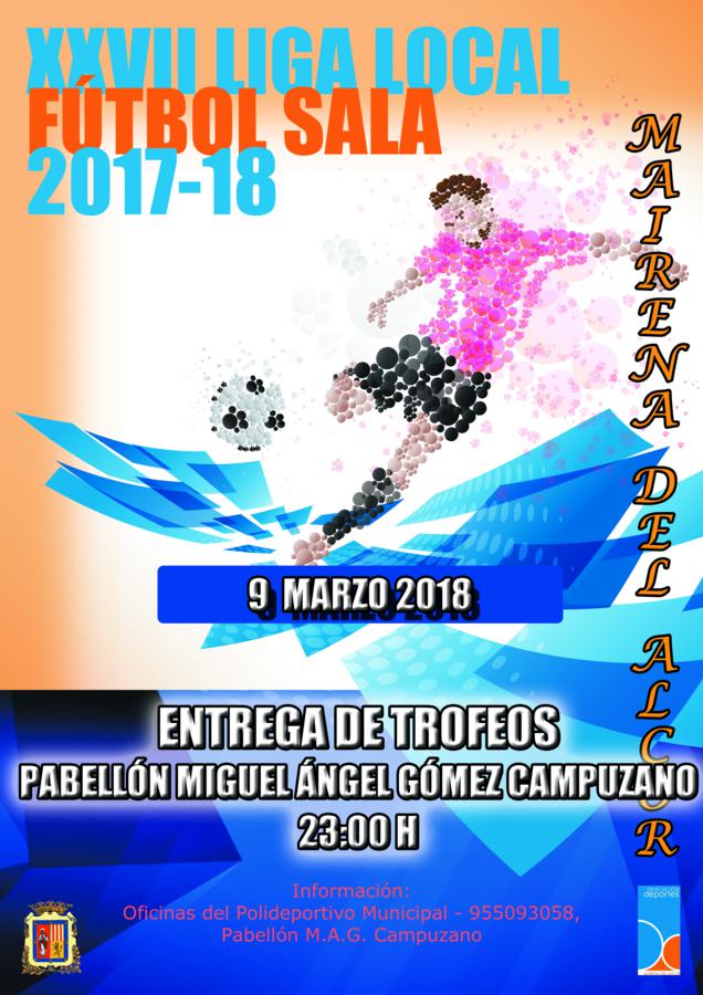La entrega de Trofeos de la XXVII Liga Local de Fútbol Sala se realizará el próximo viernes día 9 de marzo a las 23.00 horas en el Pabellón Miguel Ángel Gómez Campuzano.