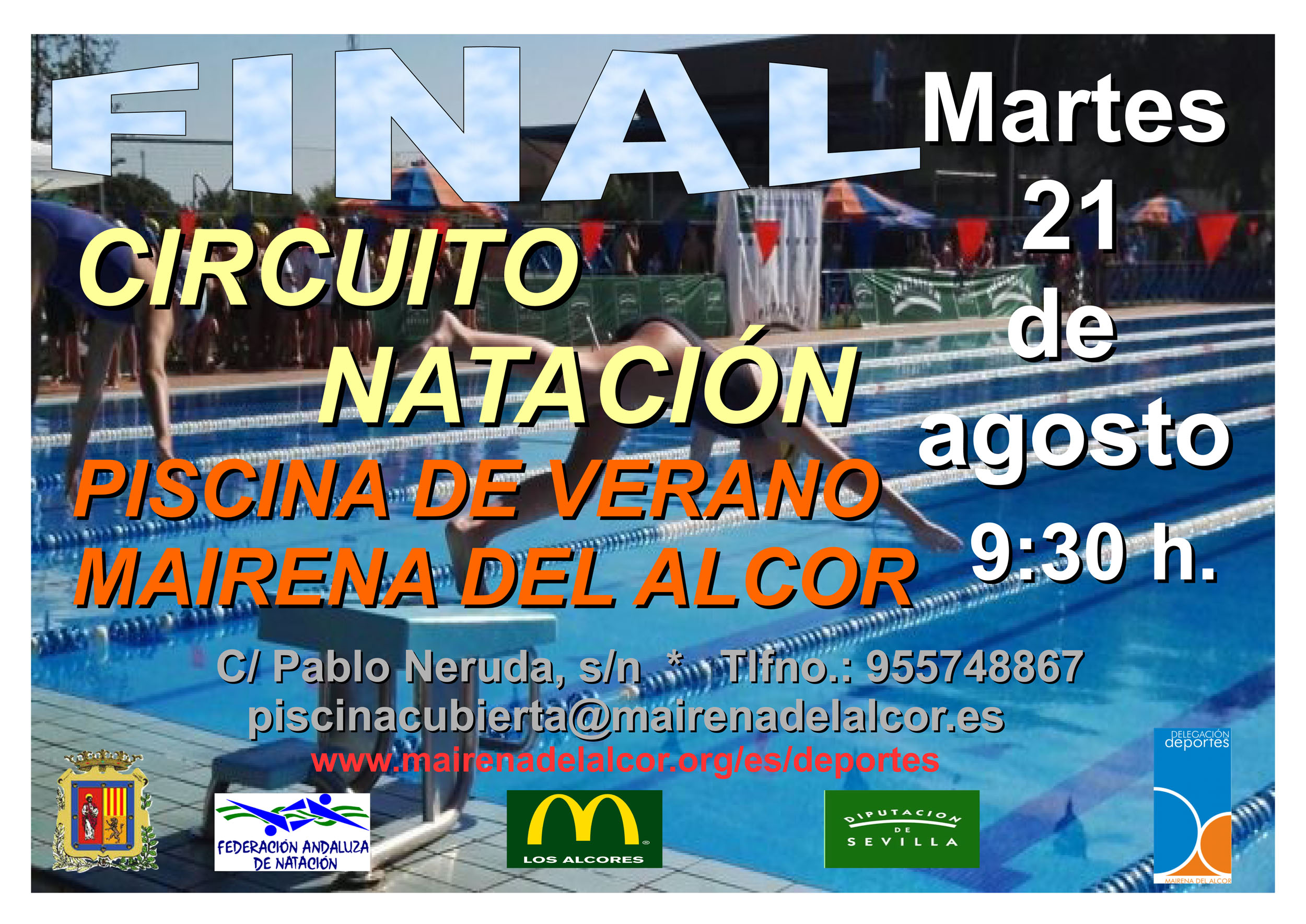 La final del grupo A del Circuito Provincial de Natación de Verano, que organiza el Servicio Técnico de Deportes del Área de Cultura y Ciudadanía de la Diputación de Sevilla, se disputará el martes 21 de agosto a las 9.30 horas en la piscina municipal de verano (calle Pablo Neruda, s/n). La entrada es gratis.