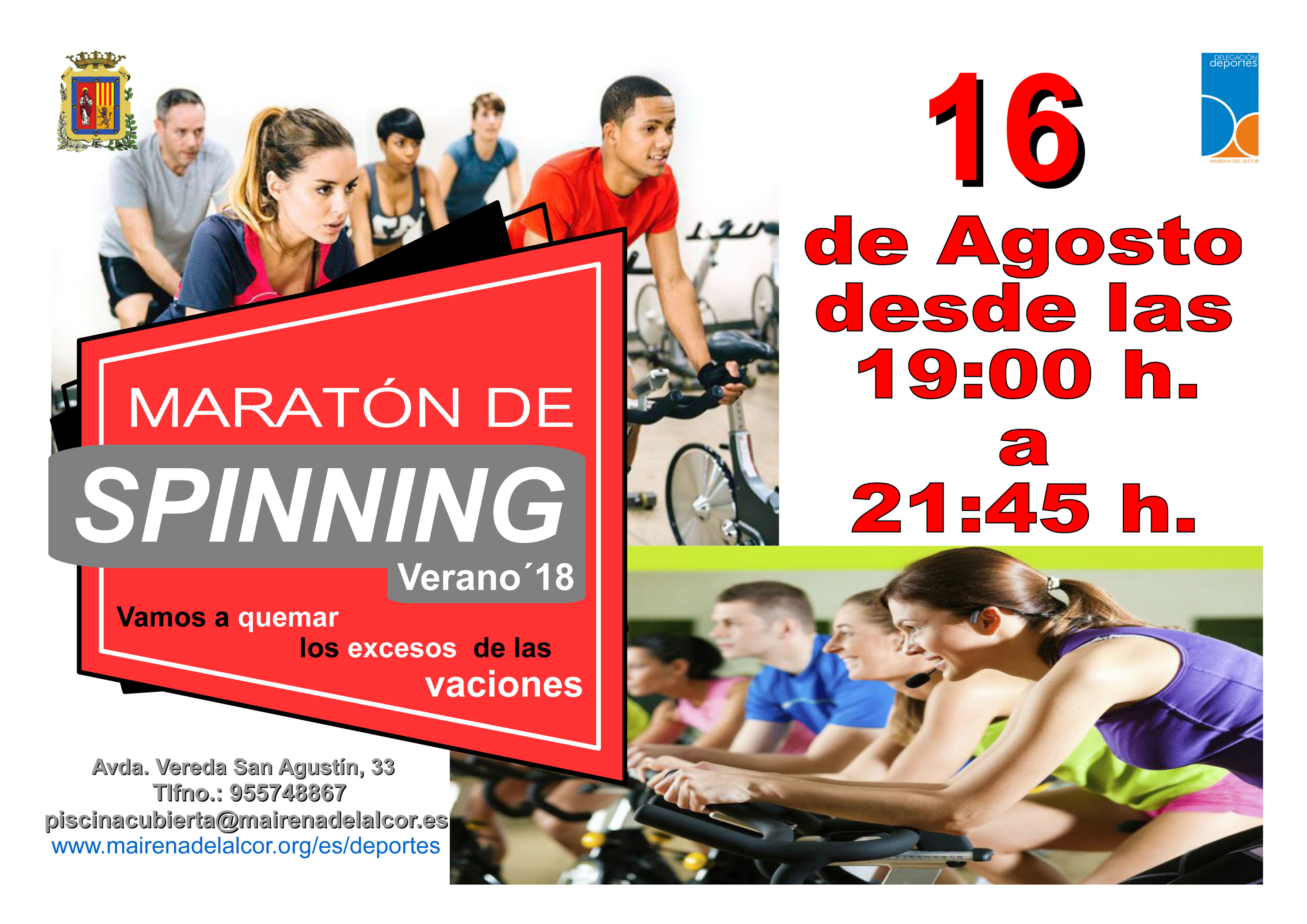 ¿Vamos a quemar los excesos de las vacaciones? La Delegación de Deportes del Ayuntamiento de Mairena del Alcor organiza un maratón de spinning en el gimnasio municipal (avenida Vereda San Agustín, 33). Será el jueves 16 de agosto de 19.00 a 21.45 horas.