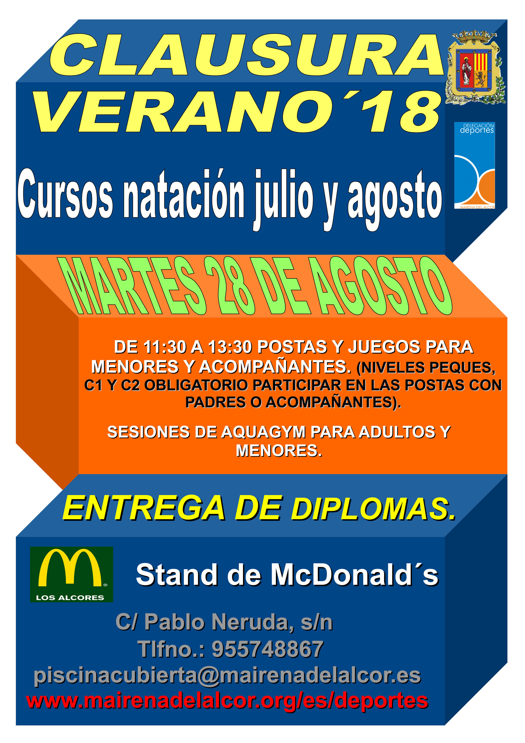 28 de agosto de 11.30 a 13.30 horas en la piscina municipal, postas y y juegos para menores y acompañantes. Sesiones de aquagym para adultos y menores. Entrega de diplomas. Stand de McDonald's. Para los niveles peques, C1 y C2 es obligatorio participar en las postas con padres o acompañantes.