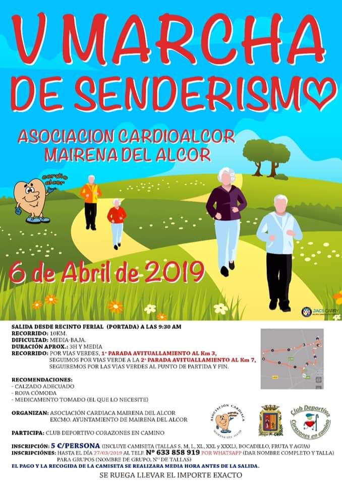 El Ayuntamiento y la Asociación Cardiaca de Mairena del Alcor organizan una nueva edición de la Marcha de Senderismo, el sábado 6 de abril, en colaboración con el Club Deportivo Corazones en Camino. En total son 10 kilómetros con dificultad media – baja que se recorrerán en unas tres horas y media.