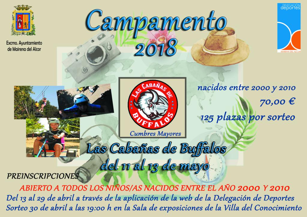 La Delegación de Deportes del Ayuntamiento de Mairena del Alcor organiza un campamento para todos los niños nacidos entre los años 2000 al 2010. Tendrá lugar del 11 al 13 de mayo en las Cabañas de Buffalos, Huelva.