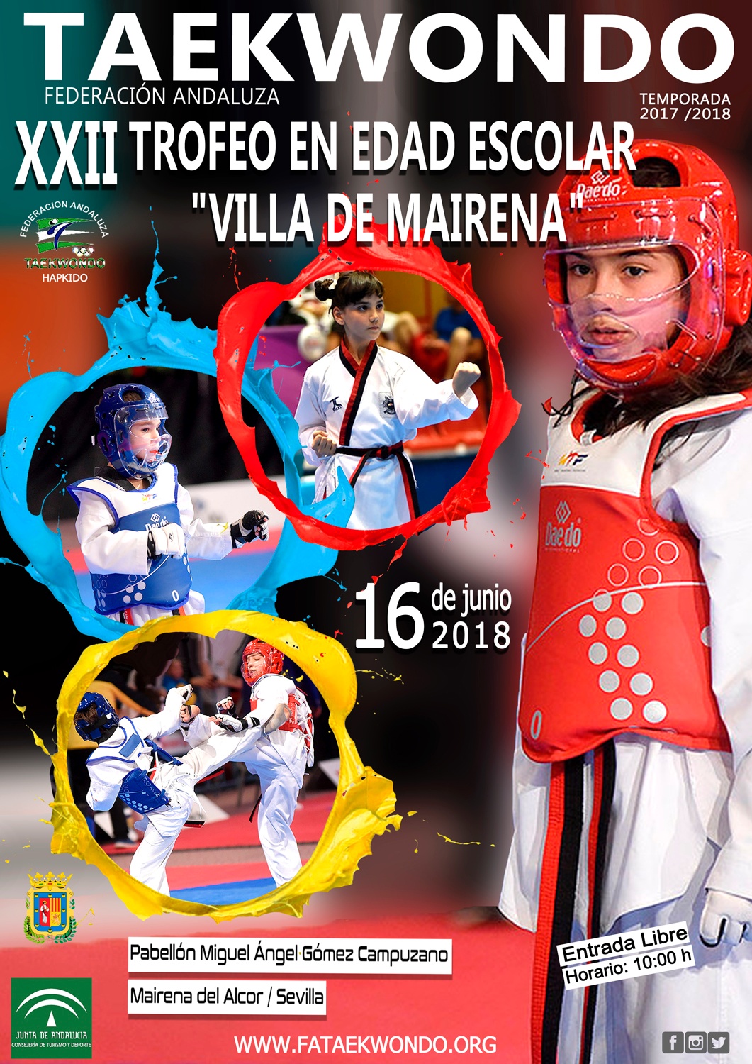 975 taekwondistas procedentes de Cádiz, Huelva, Málaga y Sevilla participarán mañana sábado en el XXII Trofeo en Edad Escolar Villa de Mairena. Se disputará a las 10.00 horas en los 6 tatamis que se han instalado en el Pabellón Miguel Ángel Gómez Campuzano.
