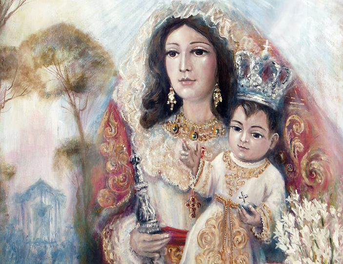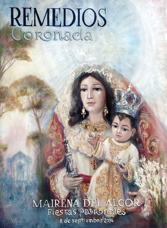 El cartel de las fiestas patronales 2018 de Nuestra Señora de los Remedios Coronada, patrona canónica y Alcaldesa Perpetua de Mairena del Alcor, es obra de Ventura Gómez y lo edita la Delegación de Cultura del Ayuntamiento de Mairena del Alcor.