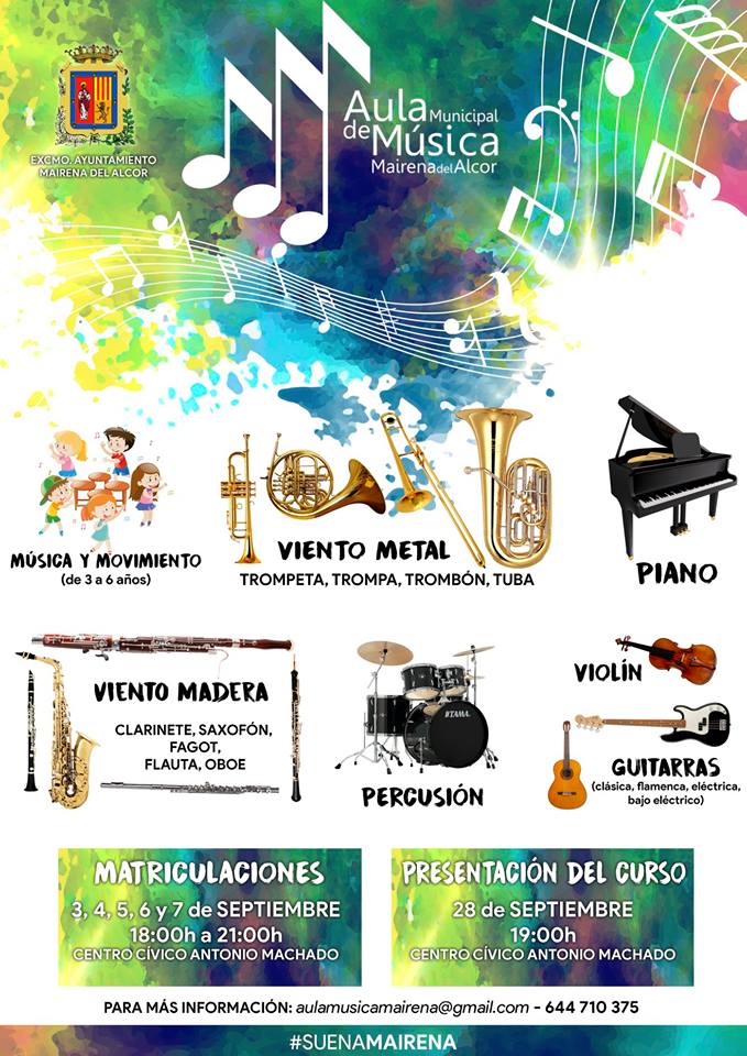 ¿Te gusta la música? ¿Quieres tocar algún instrumento? El lugar ideal para aprender y disfrutar con la música desde los 3 años de edad es el Aula Municipal de Música de Mairena del Alcor. Podrás elegir cualquier instrumento de la familia viento metal o de viento madera, además de la amplia familia de la percusión, piano, guitarra o violín.