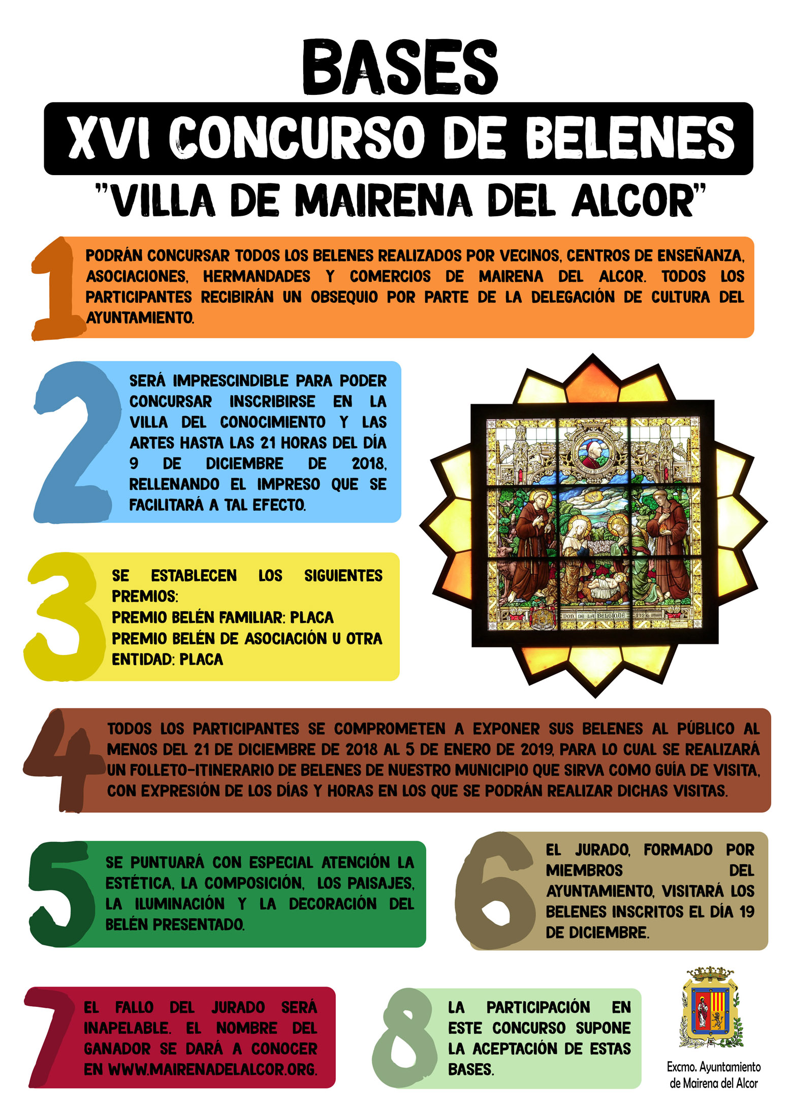 Las bases contemplan que los participantes se comprometen a exponer sus belenes al público, al menos del 21 de diciembre de 2018 al 5 de enero de 2019. La Delegación de Cultura editará un folleto – itinerario de belenes, incluyendo los días y horas en los que se podrán visitar.