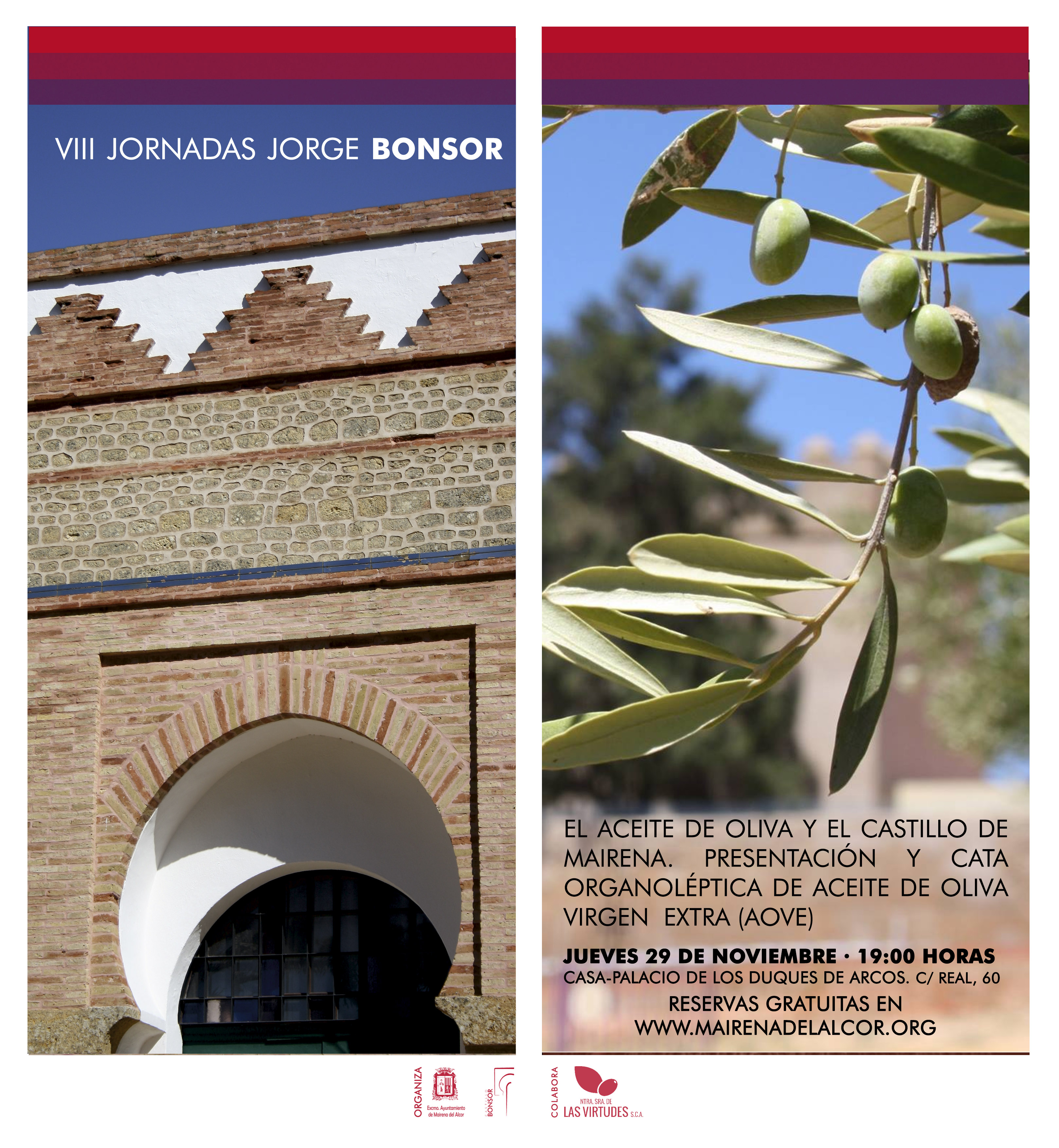Las VIII Jornadas Jorge Bonsor "Una apuesta por la socialización del conocimiento" continúan en el mes de noviembre con una nueva actividad gratuita 'El aceite de oliva y el Castillo de Mairena. Presentación y cata organoléptica de aceite de oliva virgen extra (AOVE), el jueves 29 a las 19.00 horas en la Casa Palacio de los Duques de Arcos con acceso por la calle Real, 60. Para participar es imprescindible inscribirse en este enlace.