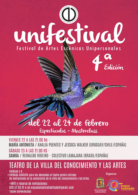 En esta edición, los espectáculos y compañías participantes serán: María Antonieta, por Analía Puentes, con la dirección de Jessica Walker (Uruguay/Chile/España). Y Samba, de Reinaldo Ribeiro – Colectivo Lamajara (Brasil/España).