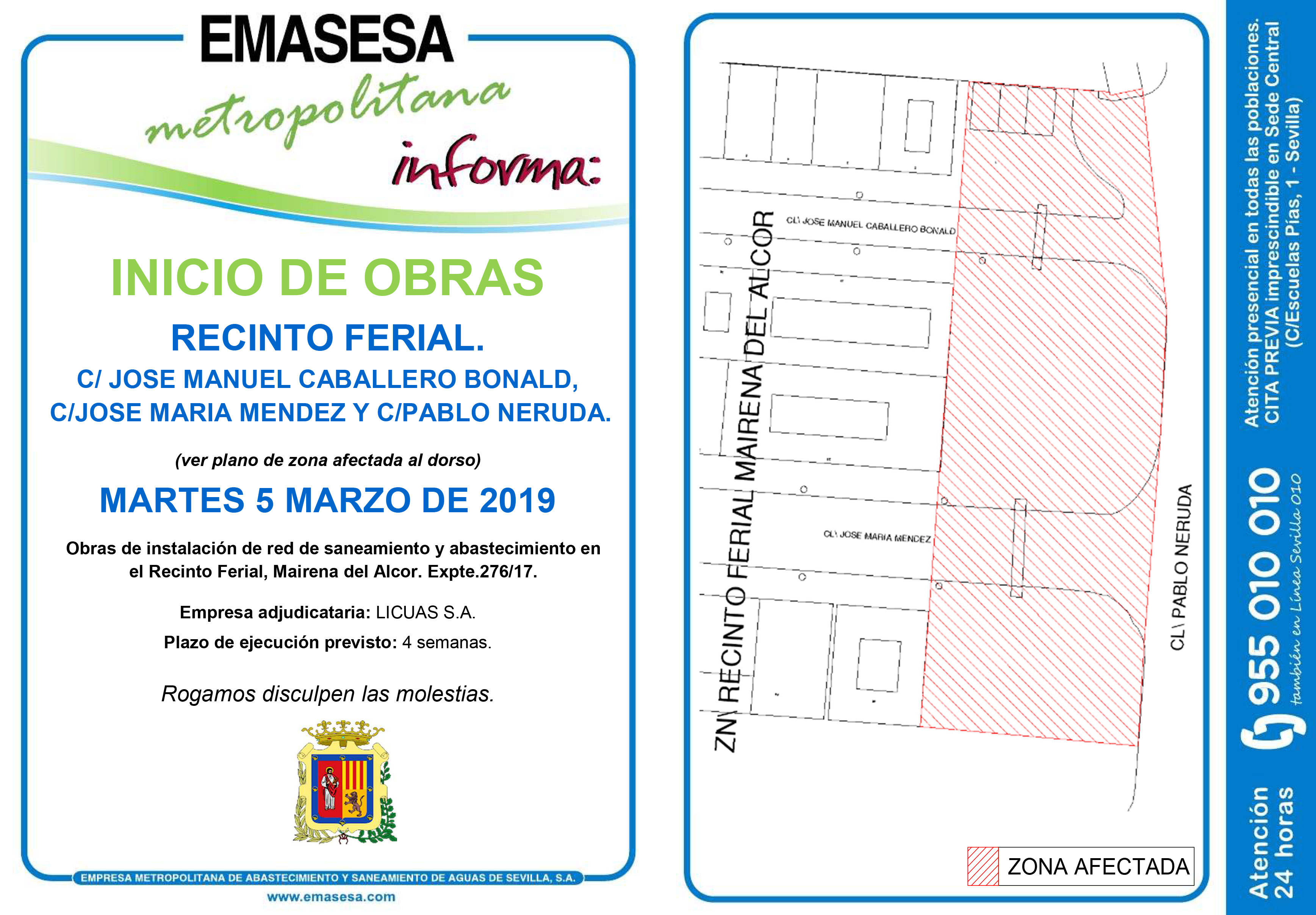 A principios de marzo se iniciará la primera fase de las obras en la feria. Se actuará en la fachada del recinto ferial Alcalde Antonio Delgado. Las obras consistirán en la prolongación para renovación de red de abastecimiento y saneamiento de las calles Jose Manuel Caballero Bonald, Jose Maria Méndez y Pablo Neruda. Se canalizarán o sustituirán las redes de abastecimiento en tuberías de fundición dúctil y el saneamiento mediante colectores de gres.