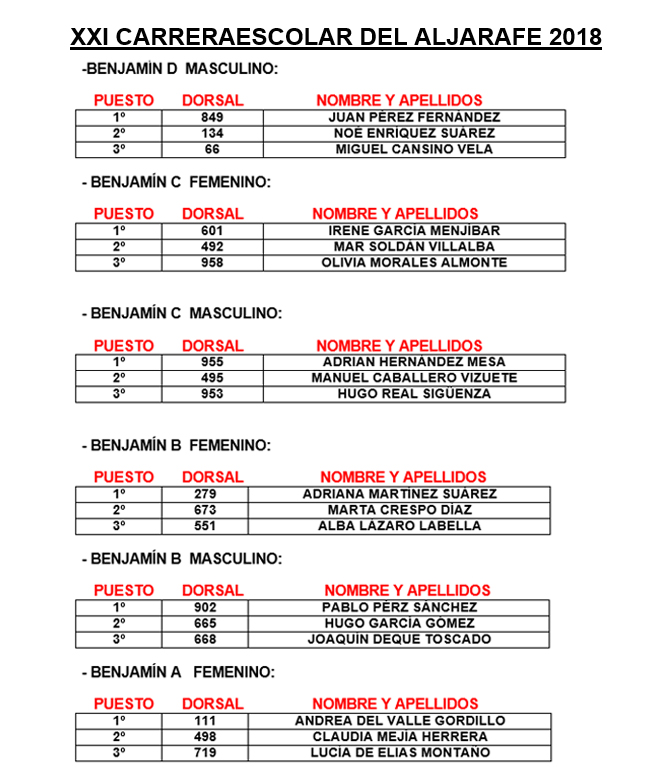 Cuando el reloj marcaba las 10:30 de la mañana, se comenzaron a suceder las distintas pruebas atléticas, diferenciadas por categoría y sexo, cada una de ellas con su respectiva longitud. Comenzaron las pruebas con la carrera escolar en categoría infantil (1.000 metros), sucedida por las pruebas de categoría alevín a las 10:50 h. (800 metros), benjamín D a las 11:20 h. (600 metros), benjamín C a las 11:45 h. (600 metros), benjamín B 12:10 h, (400 metros), benjamín A a las 12:30 h. (400 metros), y prebenjamín D a las 12:50 h. (200 metros), respectivamente.
