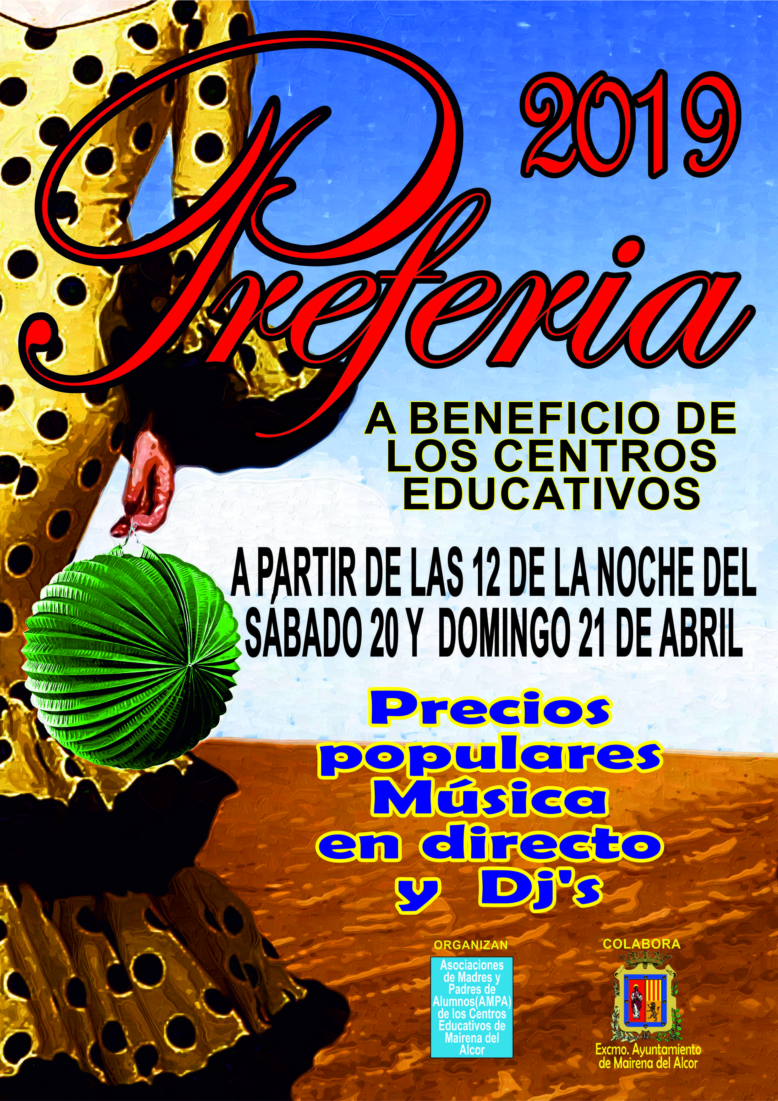 La Preferia 2019 se celebrará desde las 24.00 horas del Sábado Santo al Domingo de Resurrección a beneficio de los centros educativos, organizada por las asociaciones de madres y padres de alumnos de los centros educativos maireneros en colaboración con el Ayuntamiento de Mairena del Alcor. Habrá música en directo y Dj's.