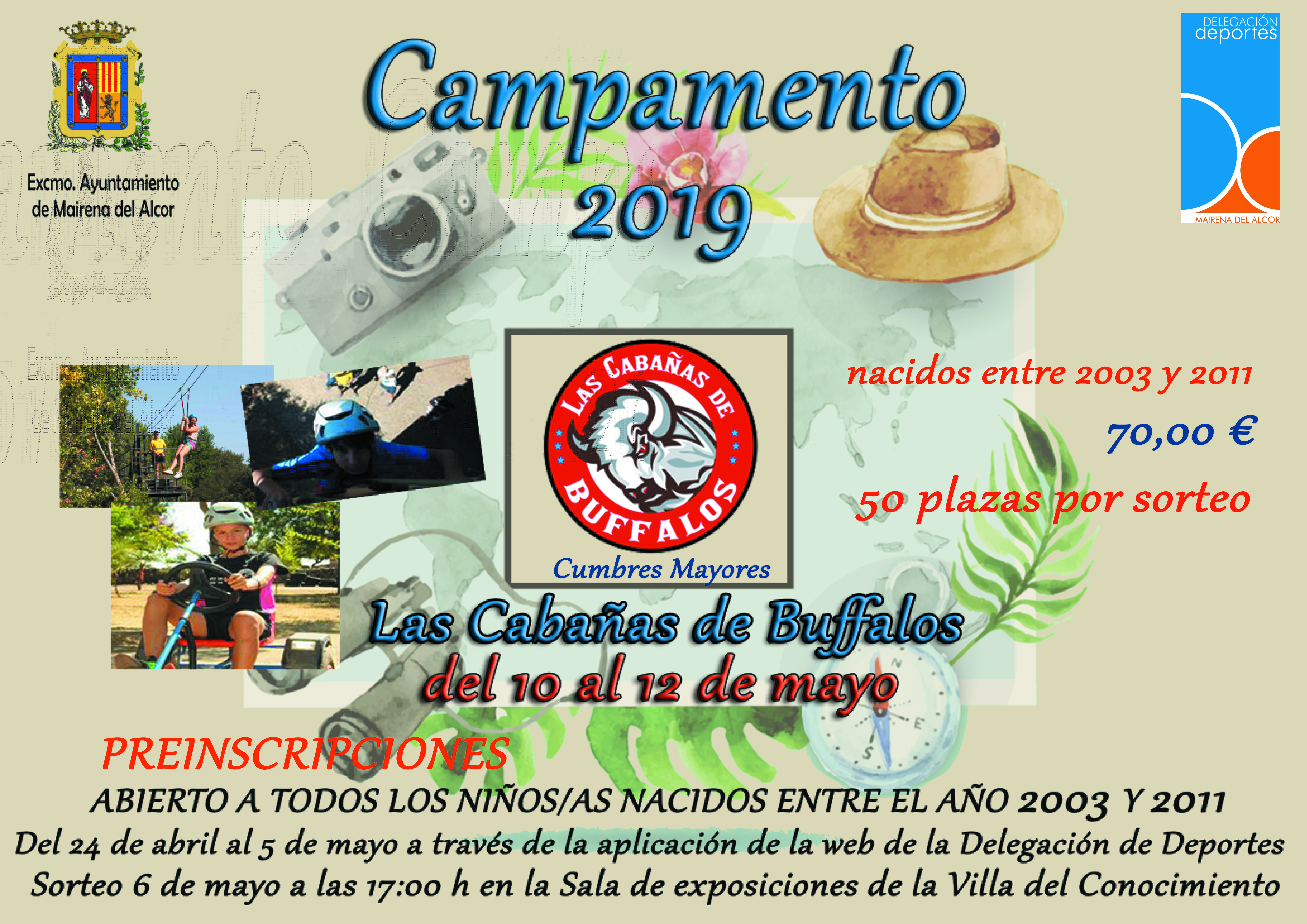 La Delegación de Deportes del Ayuntamiento de Mairena del Alcor organiza un campamento para todos los niños nacidos entre los años 2003 al 2011. Tendrá lugar del 10 al 12 de mayo en las Cabañas de Buffalos, Huelva.