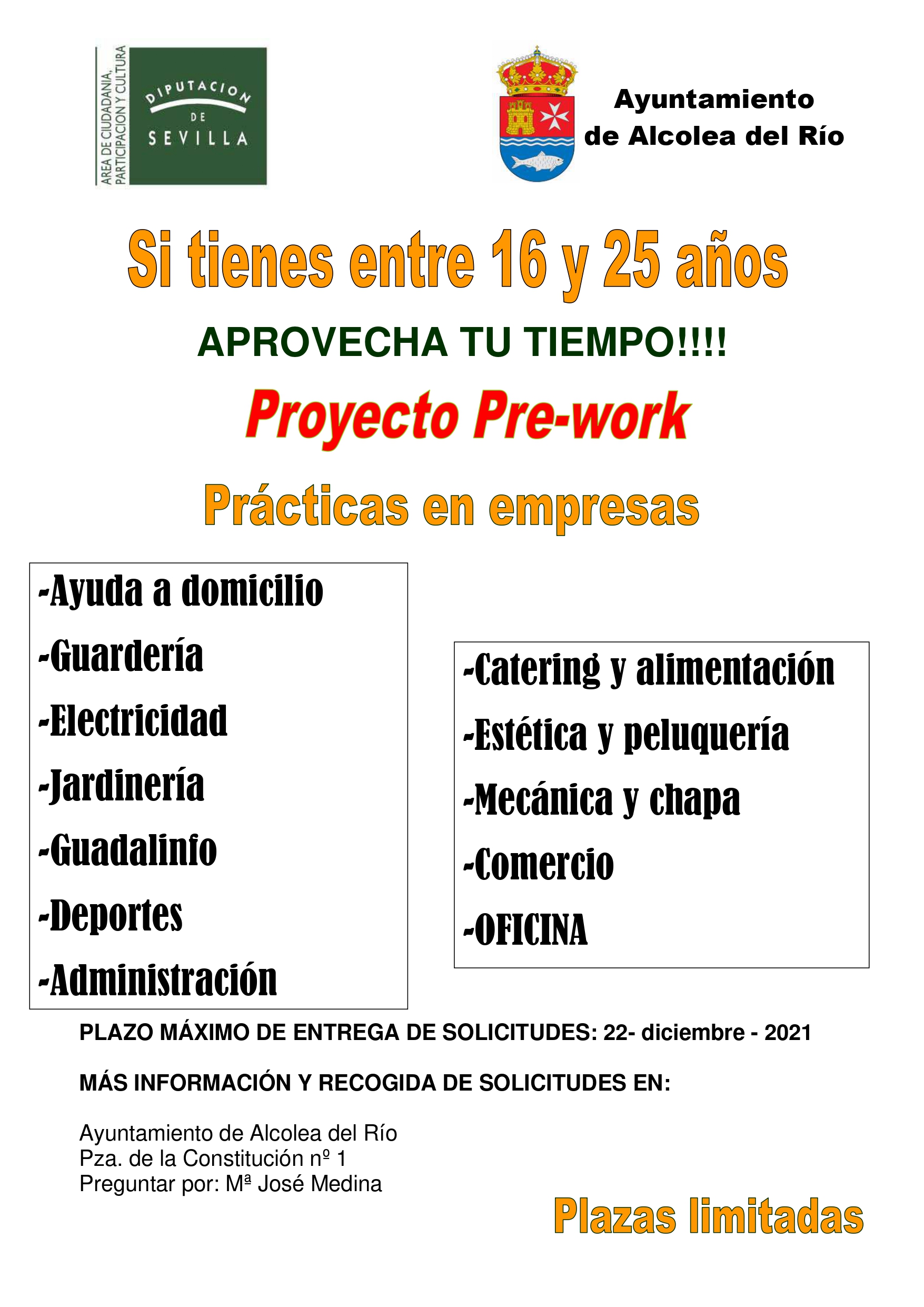 Imagen Ubicación Categoría noticia Formacion y Empleo Mostrar en el carrusel de la sección No Fecha Mar, 30/11/2021 - 11:23 Más información http://www.alcoleadelrio.es/es/actualidad/noticias/PRE-WORK-2022-00001/