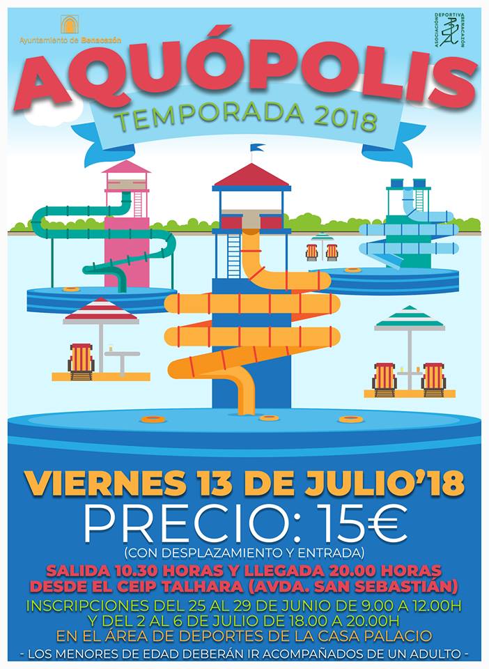 Desde el Ayuntamiento de Benacazón tenemos el placer de presentarte la visita al Parque Acuático Aquopolis (Sevilla) de esta Temporada 2018 que tendrá lugar el viernes 13 de Julio. La salida está programada a las 10.30 horas desde el frontal del CEIP Talhara (Avda. San Sebastián) y la llegada tendrá lugar en el mismo punto alrededor de las 20.00 horas.