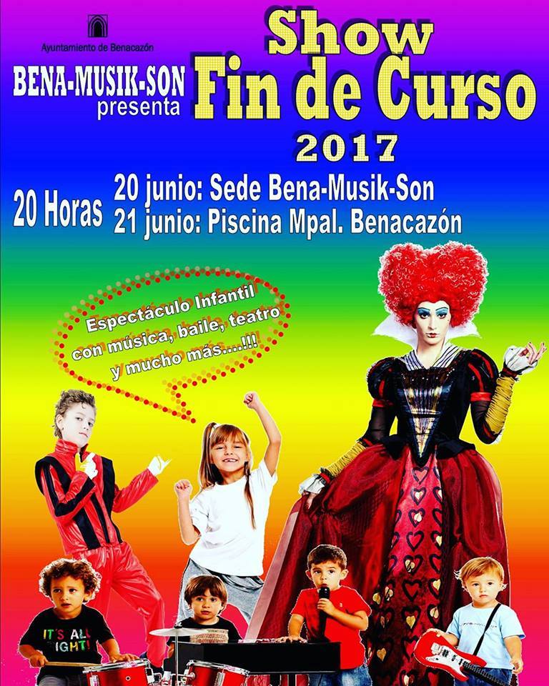 Desde el Ayuntamiento de Benacazón te informamos sobre el Show Fin de Curso de la Asociación Cultural Bena-Musik-Son con actuaciones infantiles que incluyen música, teatro, bailes y mucho más. Este acto tendrá lugar el martes 20 de Junio de 2017 en la sede de la asociación de la calle Federico García Lorca y el miércoles 21 de Junio en las instalaciones de la Piscina Municipal de Verano, ambos días a las 20.00 horas.