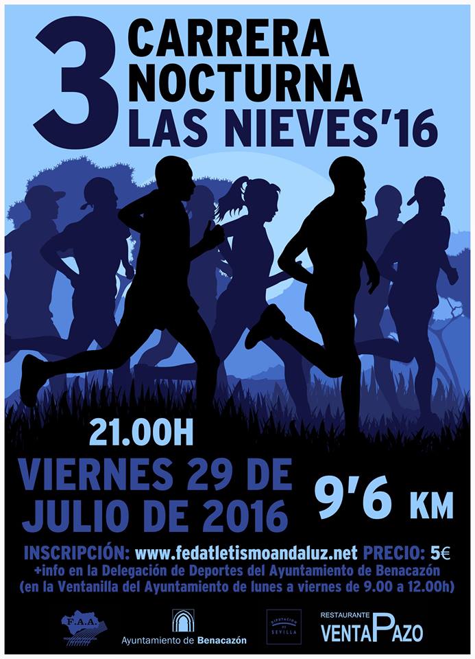 La Tercera Carrera Nocturna "Las Nieves'16" se enmarca dentro del conjunto de actividades organizadas por el Ayuntamiento de Benacazón y distintas entidades locales en honor a nuestras Fiestas Patronales y que aglutina un gran número de competiciones deportivas con el objetivo de ocupar el tiempo libre de los vecinos y vecinas de una manera lúdica, responsable y saludable, al mismo tiempo que se conmemora la devoción de nuestro pueblo por su Patrona, la Virgen de las Nieves. Desde el Ayuntamiento de Benacazón le animamos a que usted participe en esta actividad y que la organización de la misma sea de su agrado.