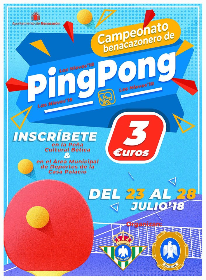 Desde el Ayuntamiento de Benacazón tenemos el placer de informarte sobre del Campeonato de PingPong, competición organizada por la Peña Cultural Bética en coordinación con el Área de Deportes del Ayuntamiento, con motivo las Fiestas Patronales de Las Nieves 2018. Este Campeonato de PingPong tendrá lugar del 23 al 28 de Julio, celebrándose el torneo en la Peña Cultural Bética (C/ Los Molinos).