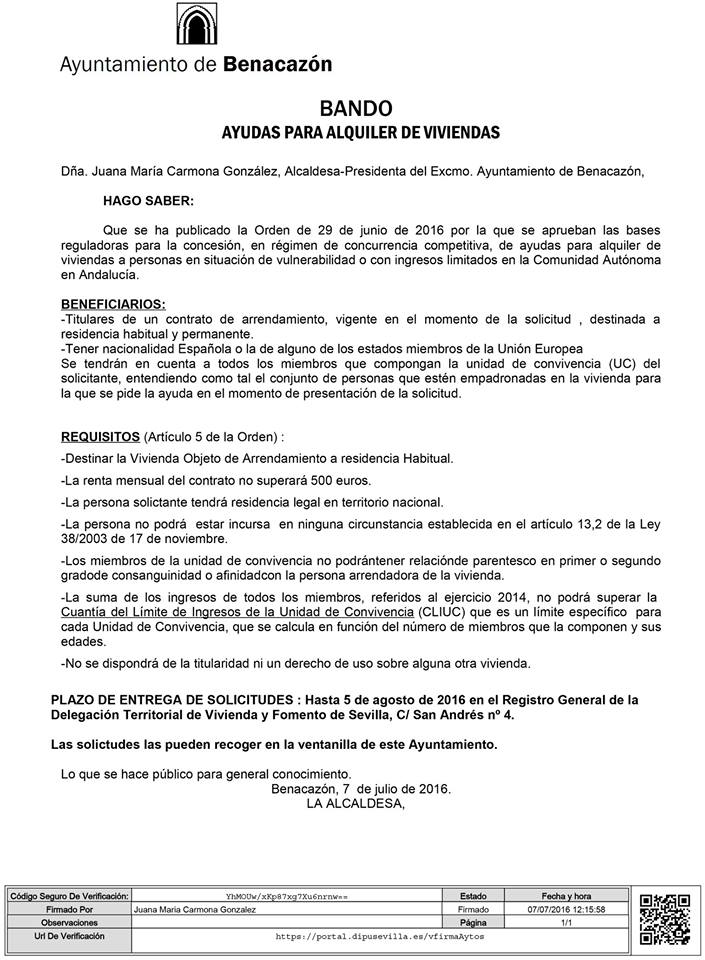 Desde el Ayuntamiento de Benacazón te informamos que hasta el 5 de Agosto de 2016 se encuentra abierto e l plazo de entrega de solicitudes para la concesión, en régimen de concurrencia competitiva, de ayudas para alquiler de viviendas a personas en situación de vulnerabilidad o con ingresos limitados dentro de Comunidad Autónoma andaluza. Puedes recoger la solicitud en la ventanilla del Ayuntamiento de Benacazón (horario de lunes a viernes de 9.00 a 14.00 horas) y entregarla hasta el 5 de Agosto en el Registro General de la Delegación Territorial de Vivienda y Fomento de Sevilla (C/ San Andrés, 4).