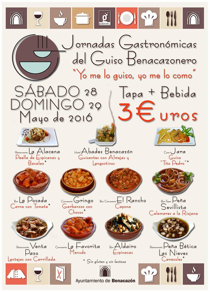 Las Jornadas Gastronómicas del Guiso Benacazonero, con el sobrenombre "Yo me lo guiso, yo me lo como", se desarrollarán el sábado 28 y el domingo 29 Mayo de 2016 en donde, por el atractivo precio de 3€, todo aquel que lo desee podrá disfrutar de una tradicional tapa de guiso y una bebida.