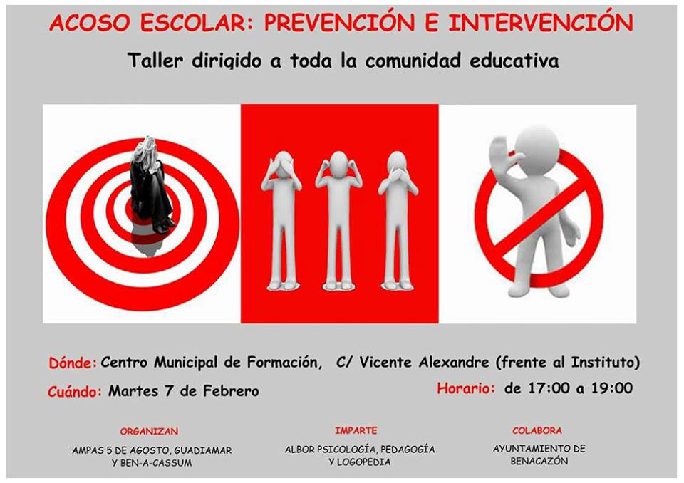 Desde el Ayuntamiento de Benacazón os informamos sobre la celebración de una nueva Jornada sobre educación, en esta ocasión titulada "Acoso escolar: Prevención e Intervención" organizado por las AMPAS "5 de Agosto", "Guadiamar" y "Ben-a-Cassum" con la colaboración del Ayuntamiento de Benacazón.