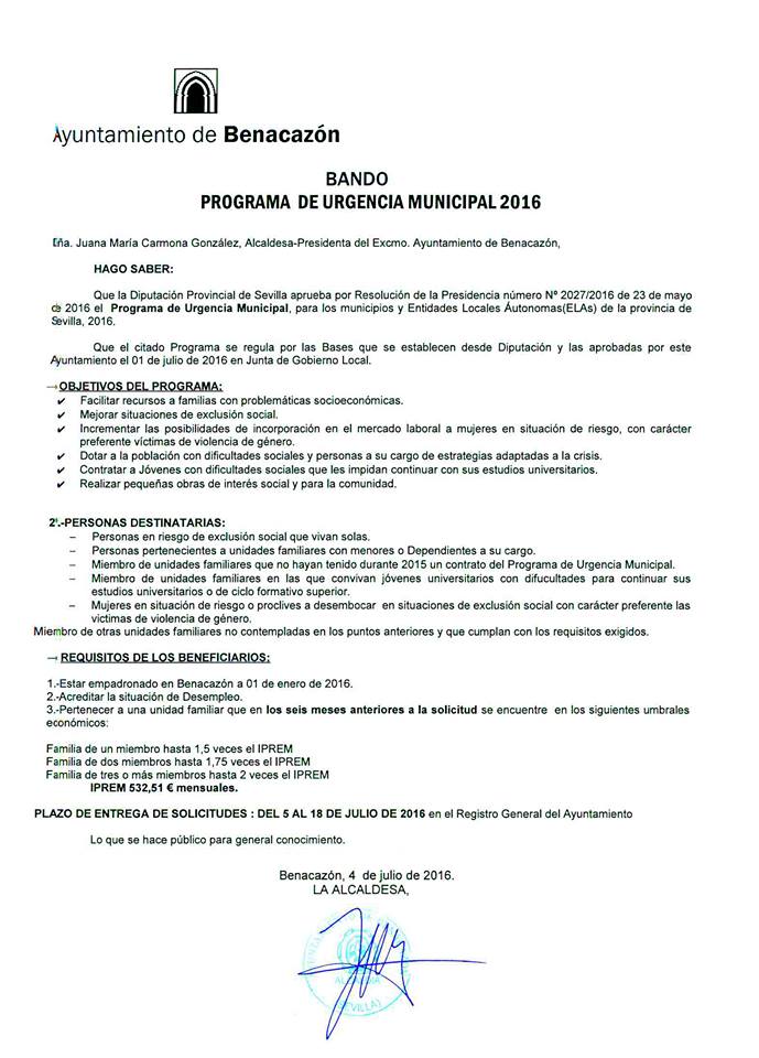 Desde el Ayuntamiento de Benacazón te informamos sobre los listados provisionales de admitidos y excluidos en el Programa de Urgencia Municipal (PUM) para los municipios y entidades locales autónomas de la provincia de Sevilla, incluido en el Programa Comunitario del Plan Provincial de Cohesión Social e Igualdad 2016/2019.