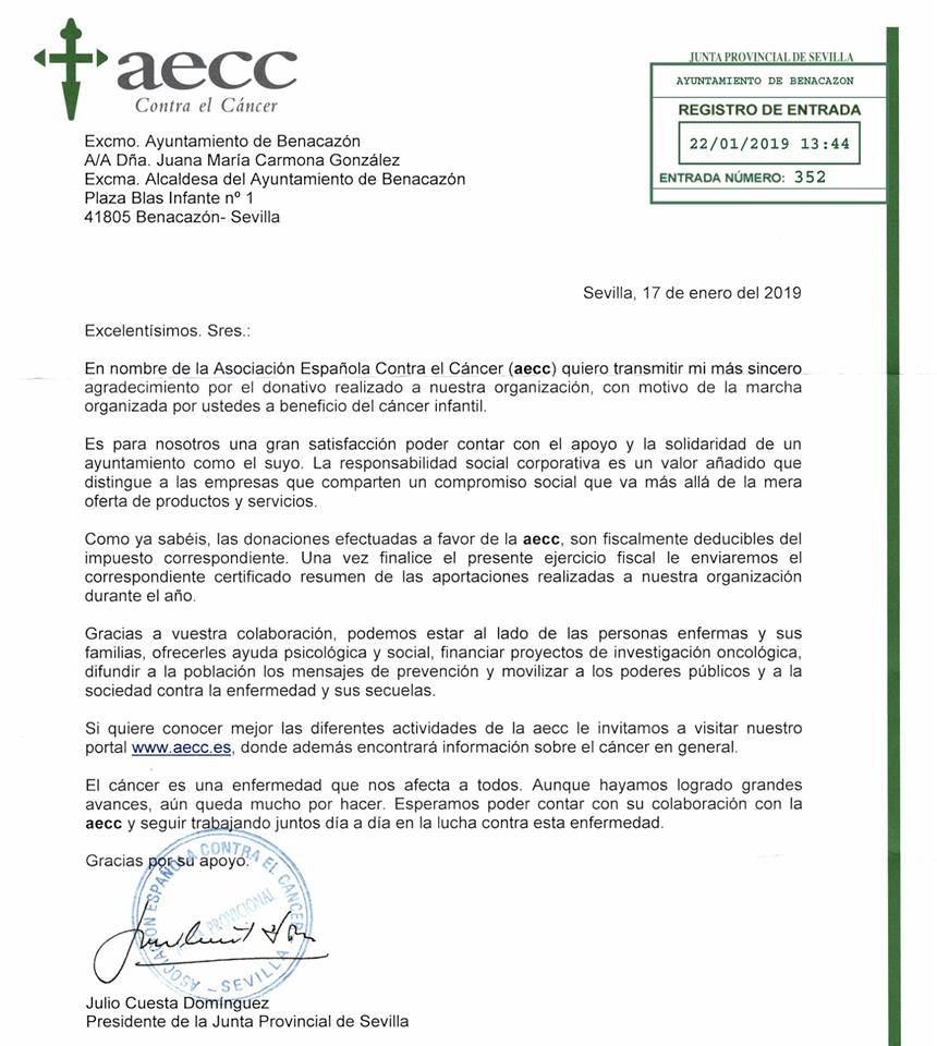 el Ayuntamiento de Benacazón te informamos sobre el escrito enviado por la Asociación Española