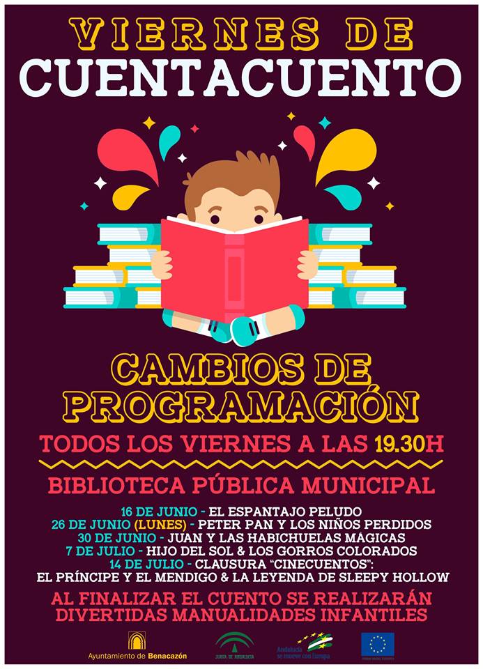 Esta actividad infantil tiene todos los viernes hasta mediados de Julio a las 18.00 horas en el Centro de Formación y Biblioteca Municipal e incluye un completo programa de fantásticas y divertidas historias de temática variada y estilos diferentes; cuentos tradicionales, narrados en verso, leyendas de otras culturas, etc... Desde el Ayuntamiento de Benacazón esperamos que esta programación organizada por la Delegación municipal de Cultura sea de su agrado, así como le animamos a que asista con sus hijos y disfrute de una agradable tarde.