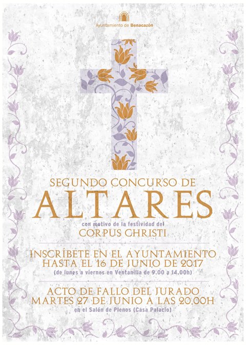 Desde el Ayuntamiento de Benacazón esperamos que la convocatoria de este concurso, organizado con motivo de la festividad del Corpus Christi, sea para usted una buena noticia, así como le animamos a que participe en estas actividades.
