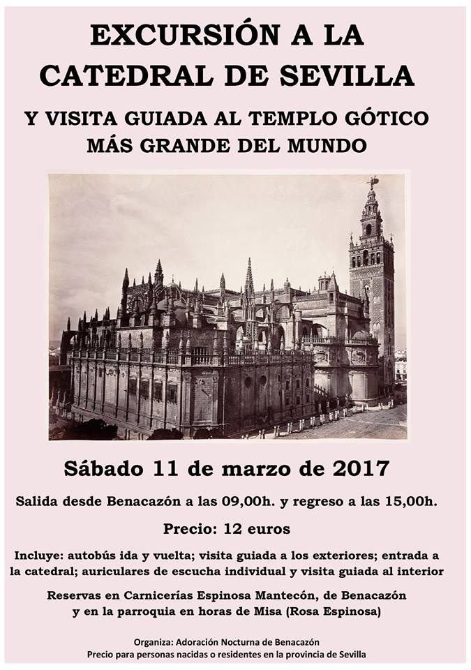 Desde el Ayuntamiento de Benacazón te informamos sobre la excursión a la Catedral de Sevilla y visita guiada al templo gótico más grande del mundo organizada por la Adoración Nocturna de Benacazón, que tendrá lugar el sábado 11 de Marzo de 2017 desde las 9.00 a las 15.00 horas.
