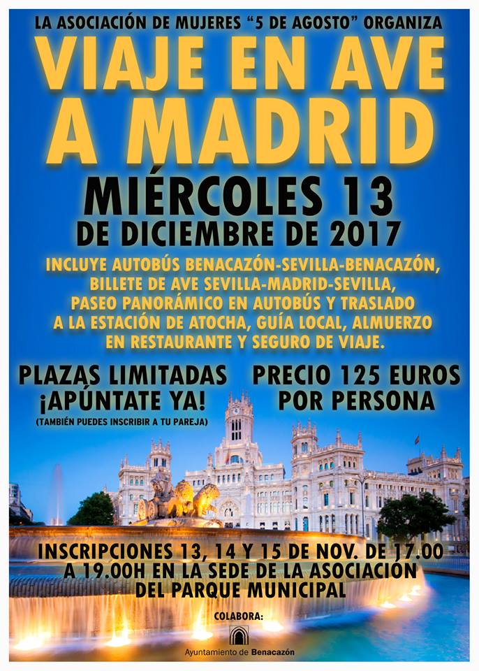Con un precio de 125 € por persona (las socias pueden inscribir también a su pareja), incluyendo desplazamiento en autobús Benacazón-Sevilla-Benacazón, billete de AVE Sevilla-Madrid-Sevilla, paseo panorámico en autobús por la ciudad y traslado a la estación de Atocha, guía local, almuerzo en el restaurante y seguro de viaje.