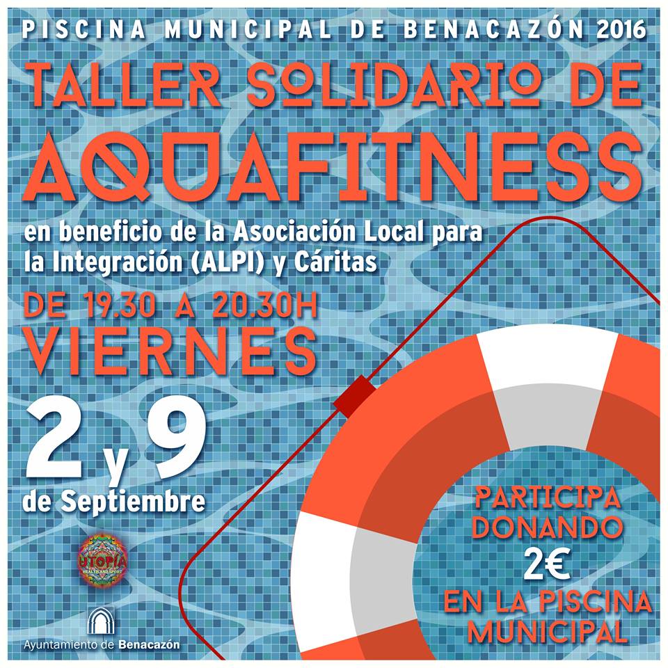 Esta iniciativa se enmarca dentro de la campaña de dinamización que lleva a cabo el Ayuntamiento de Benacazón al objeto de organizar diferentes actividades para ocupar el tiempo libre de los vecinos y vecinas de una manera saludable, al mismo tiempo que se colabora con una causa solidaria como son las Asociaciones ALPI y Cáritas. Desde el Ayuntamiento de Benacazón esperamos que la organización de esta nueva actividad sea para usted una buena noticia, así como le animamos a que participe en esta generosa iniciativa de la Piscina Municipal. ¡Colabora!