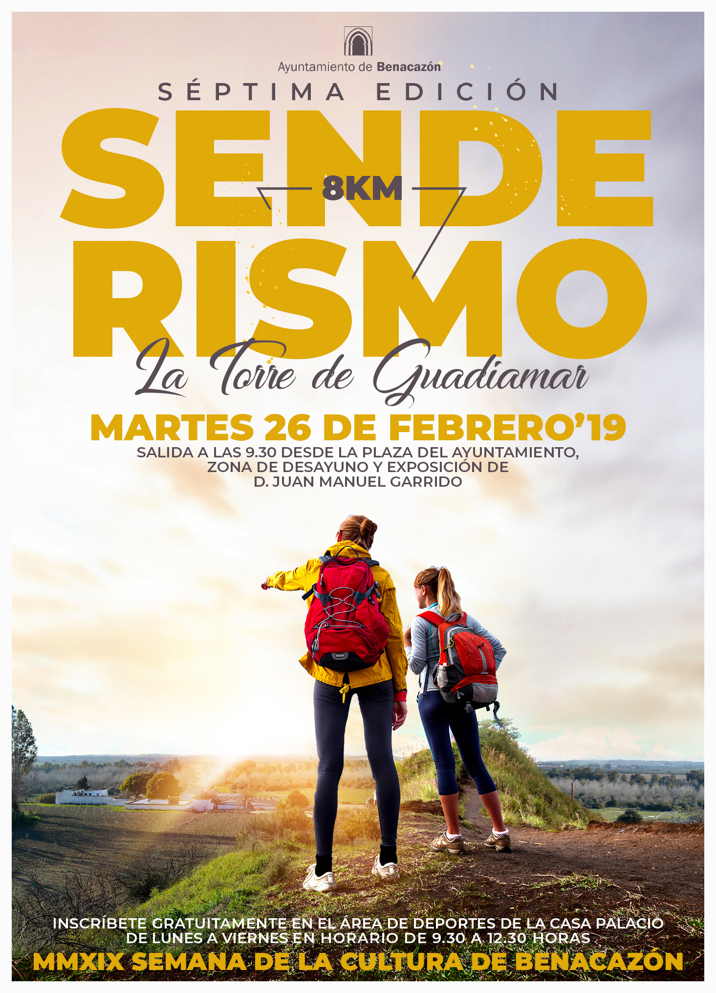 Desde el Ayuntamiento de Benacazón te informamos sobre la séptima edición del Senderismo, una actividad organizada por nuestra Delegación de Deportes con motivo de la MMXIX Semana de la Cultura de Benacazón. Puedes inscribirte en esta actividad gratuitamente en el Área de Deportes de la Casa Palacio de 9.30 a 12.30 horas.